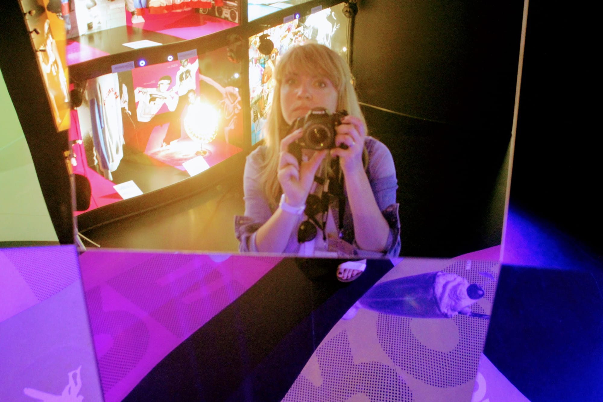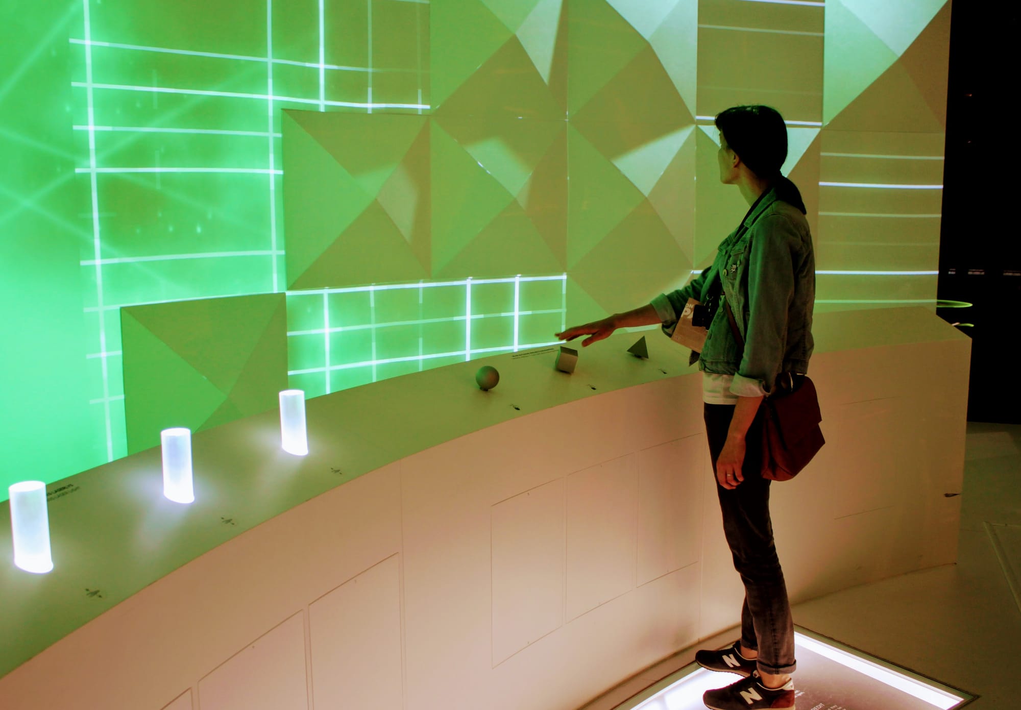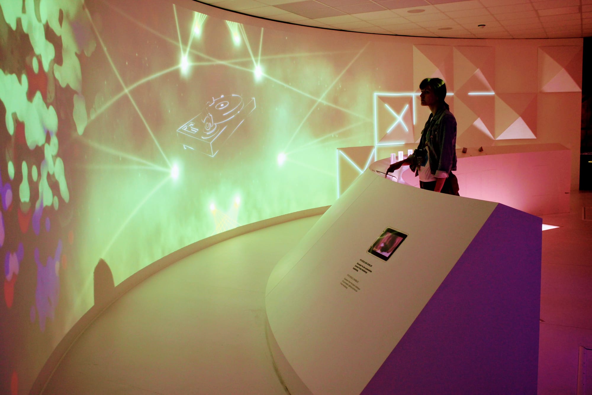 Pastatas yra trijų aukštų - dviejuose yra ekspozicija, pirmajame - parduotuvė, kavinė ir foje. Pradėjom nuo viršutinio aikšto, kur buvo didelis baltas kambarys, kuriame galima žaisti su garsais, vaizdais ir spalvomis: