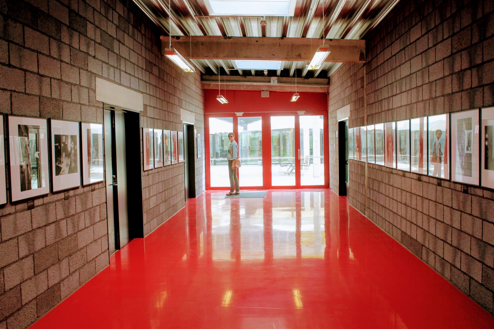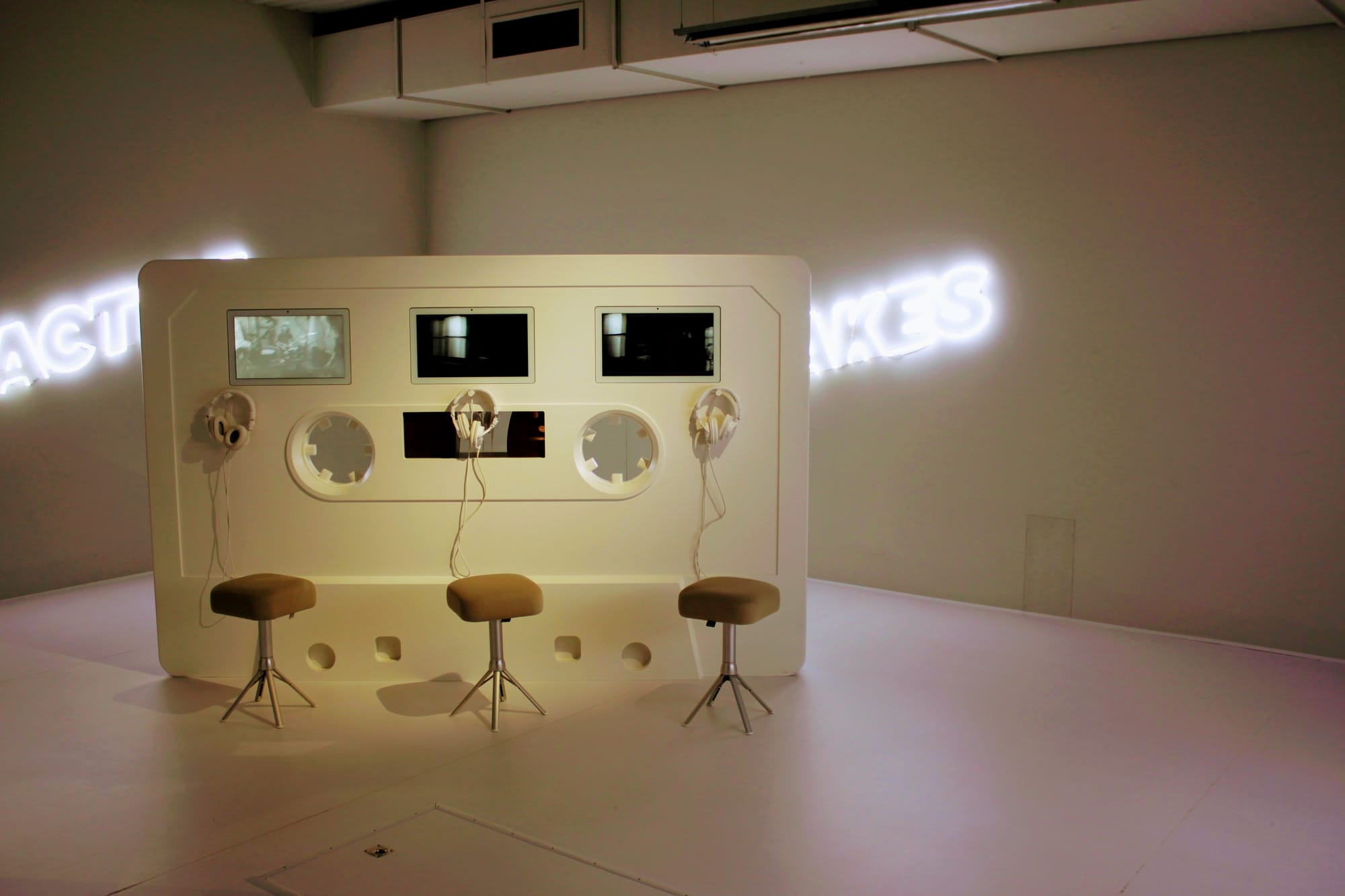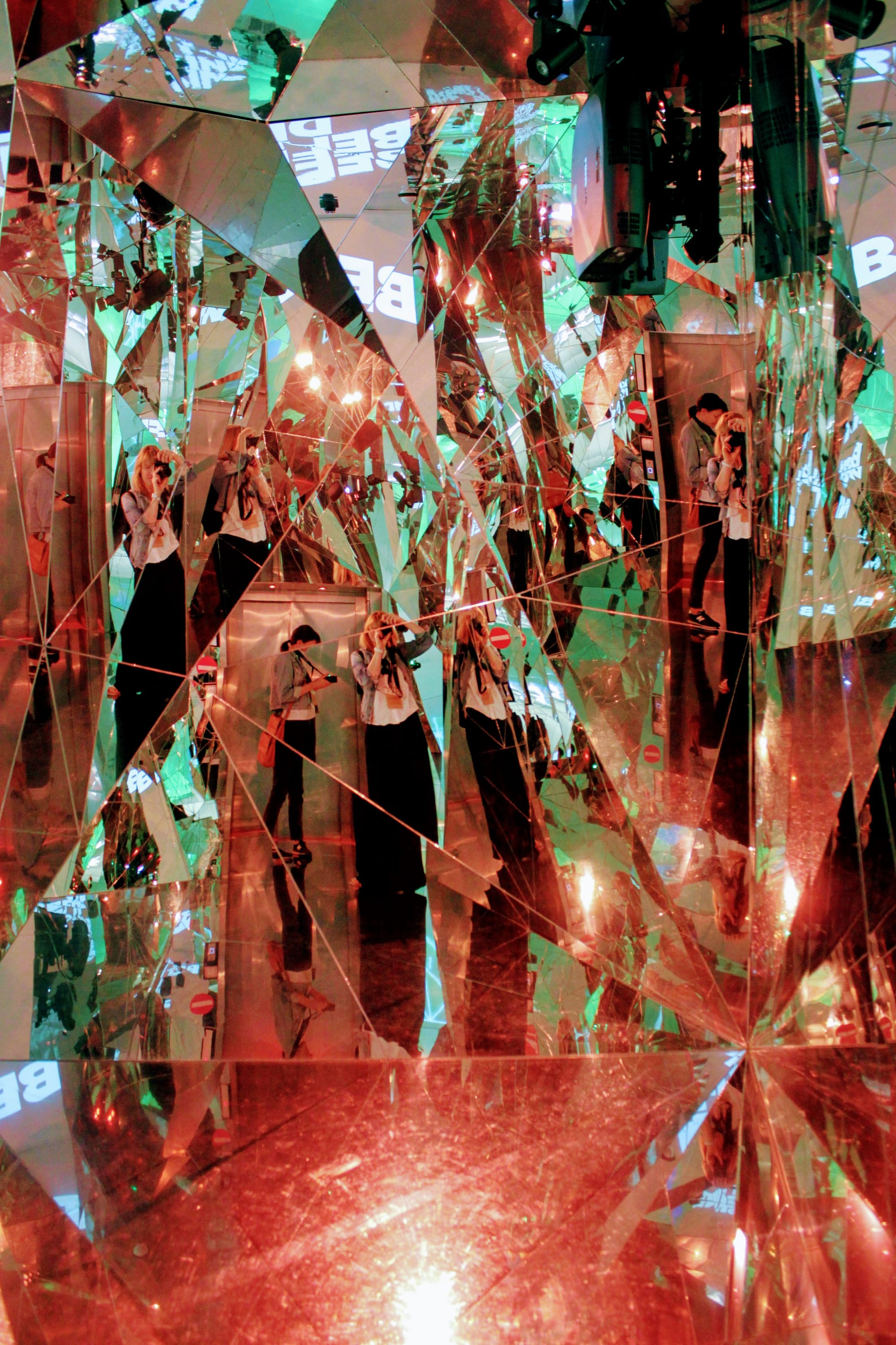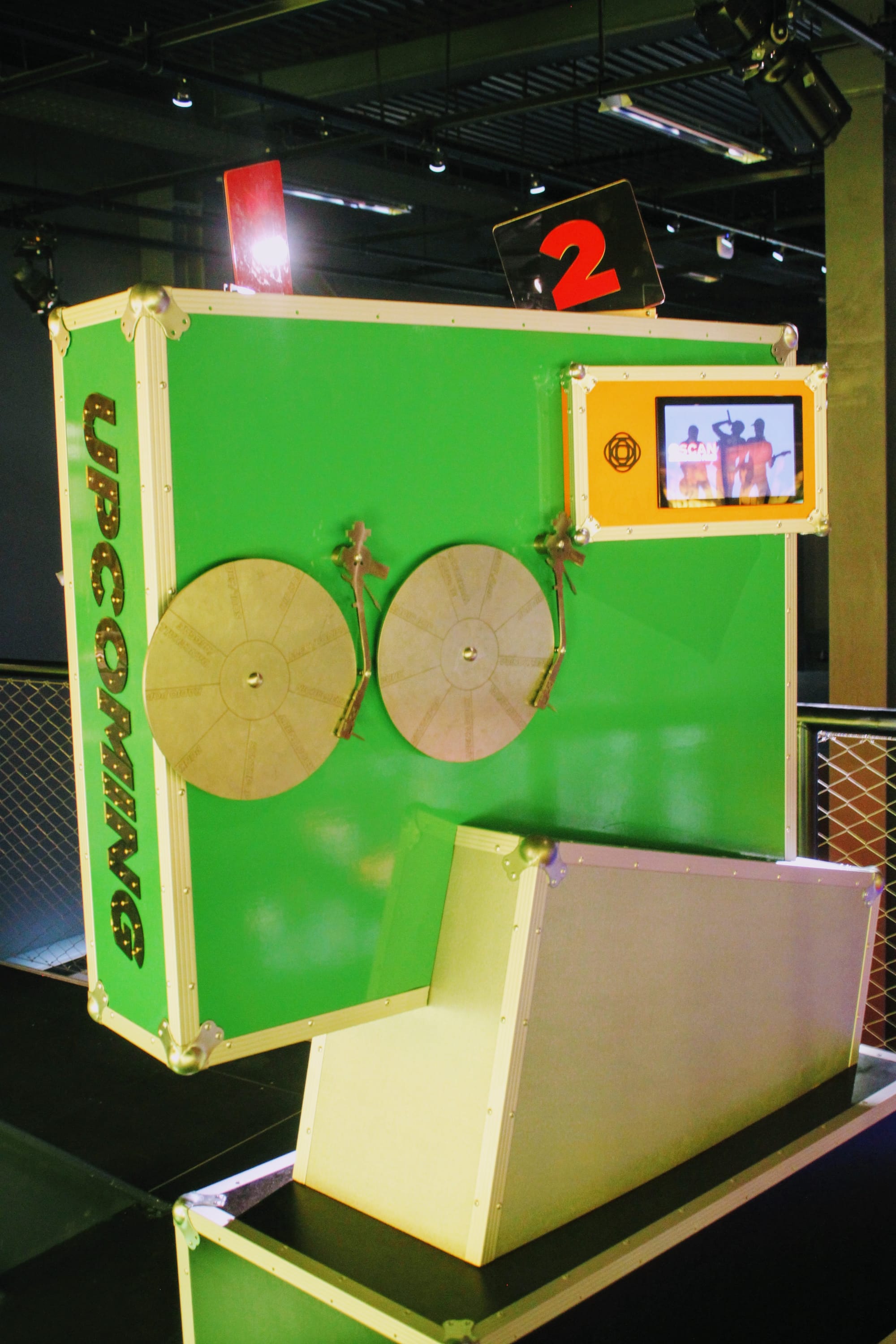 Pastatas yra trijų aukštų - dviejuose yra ekspozicija, pirmajame - parduotuvė, kavinė ir foje. Pradėjom nuo viršutinio aikšto, kur buvo didelis baltas kambarys, kuriame galima žaisti su garsais, vaizdais ir spalvomis: