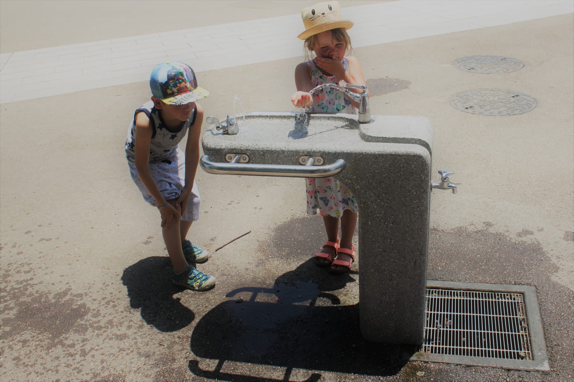 Čia Emilei yra labai karšta. Ačiū vandens "stotelėms":
