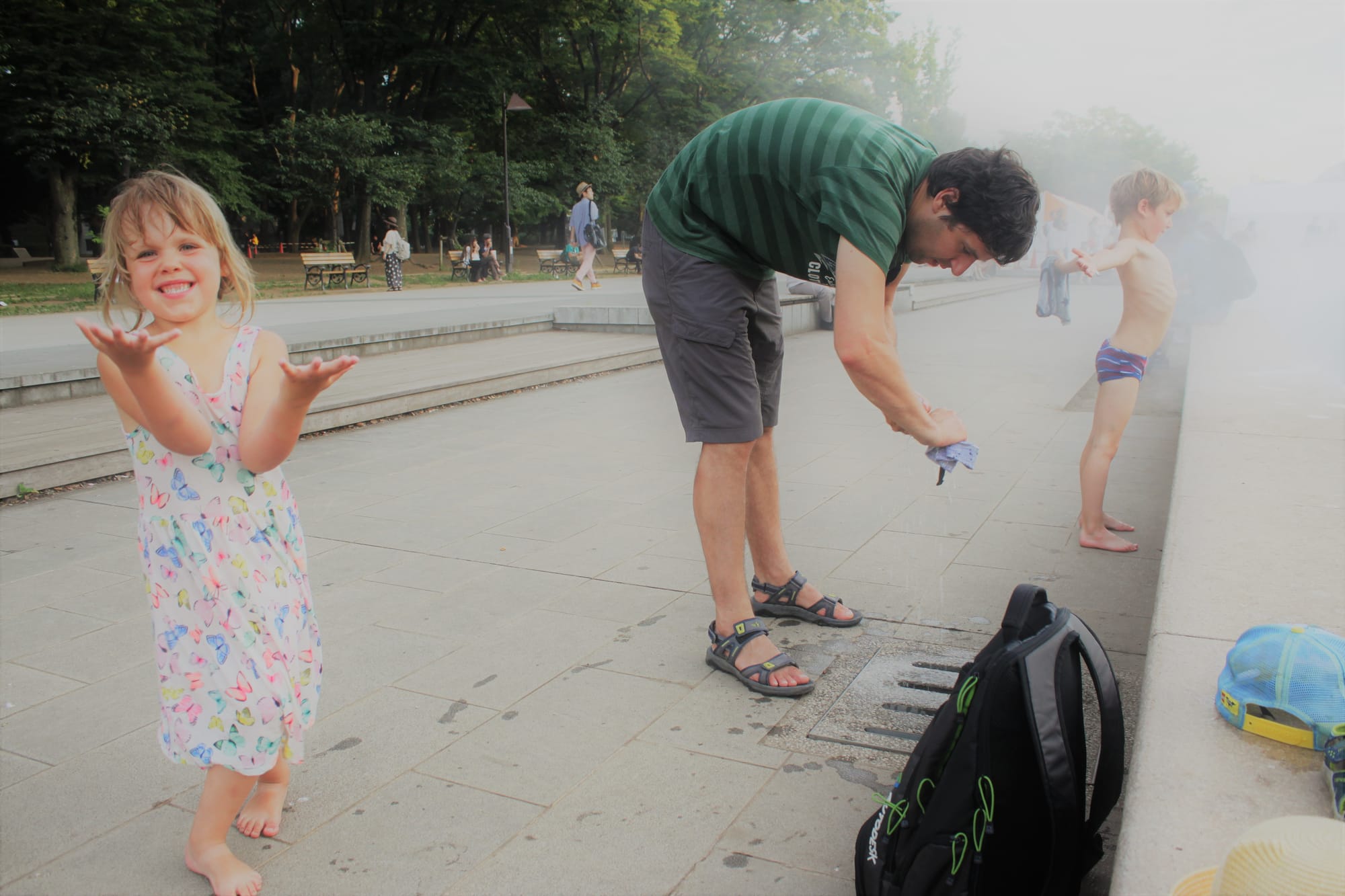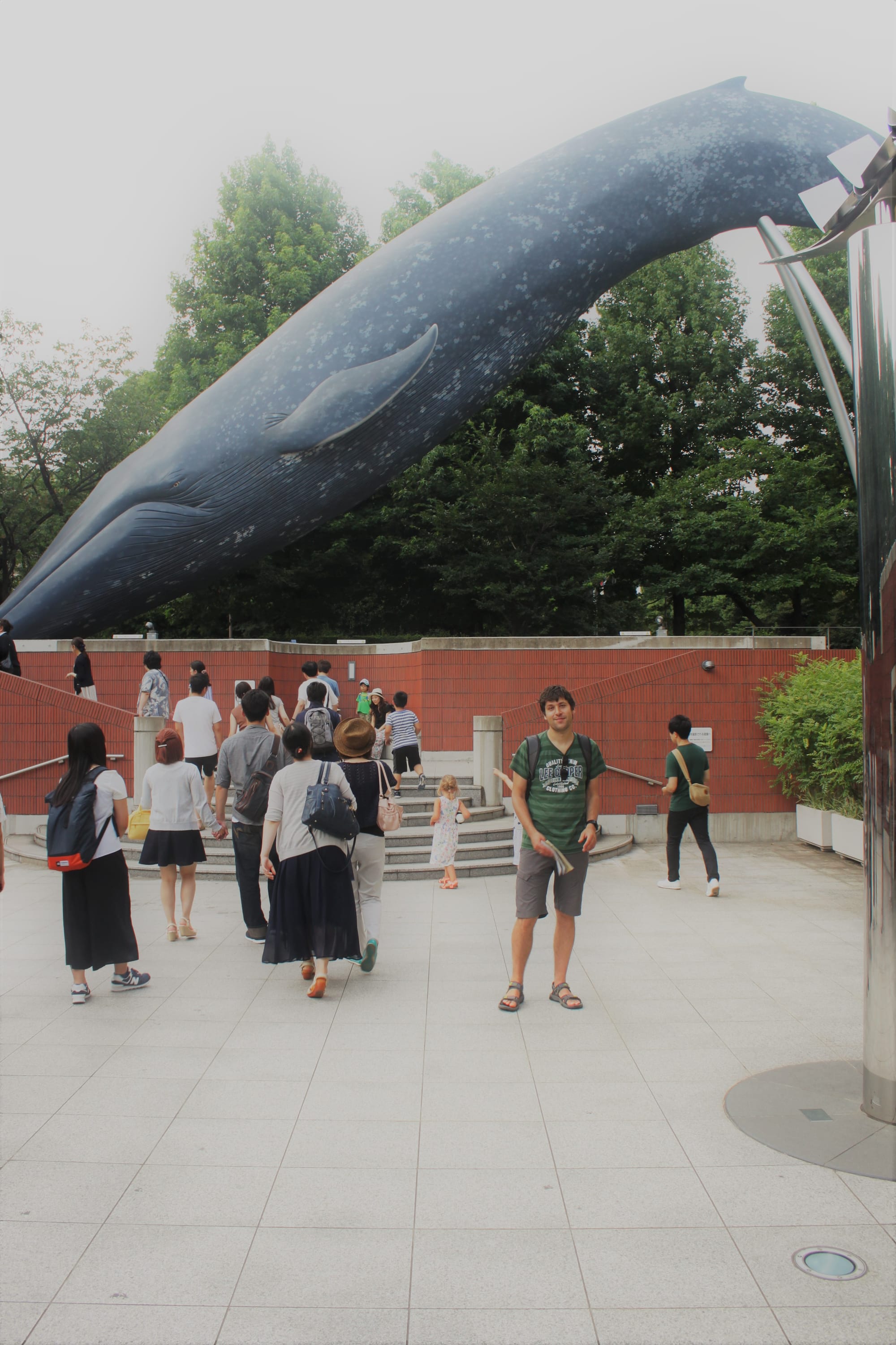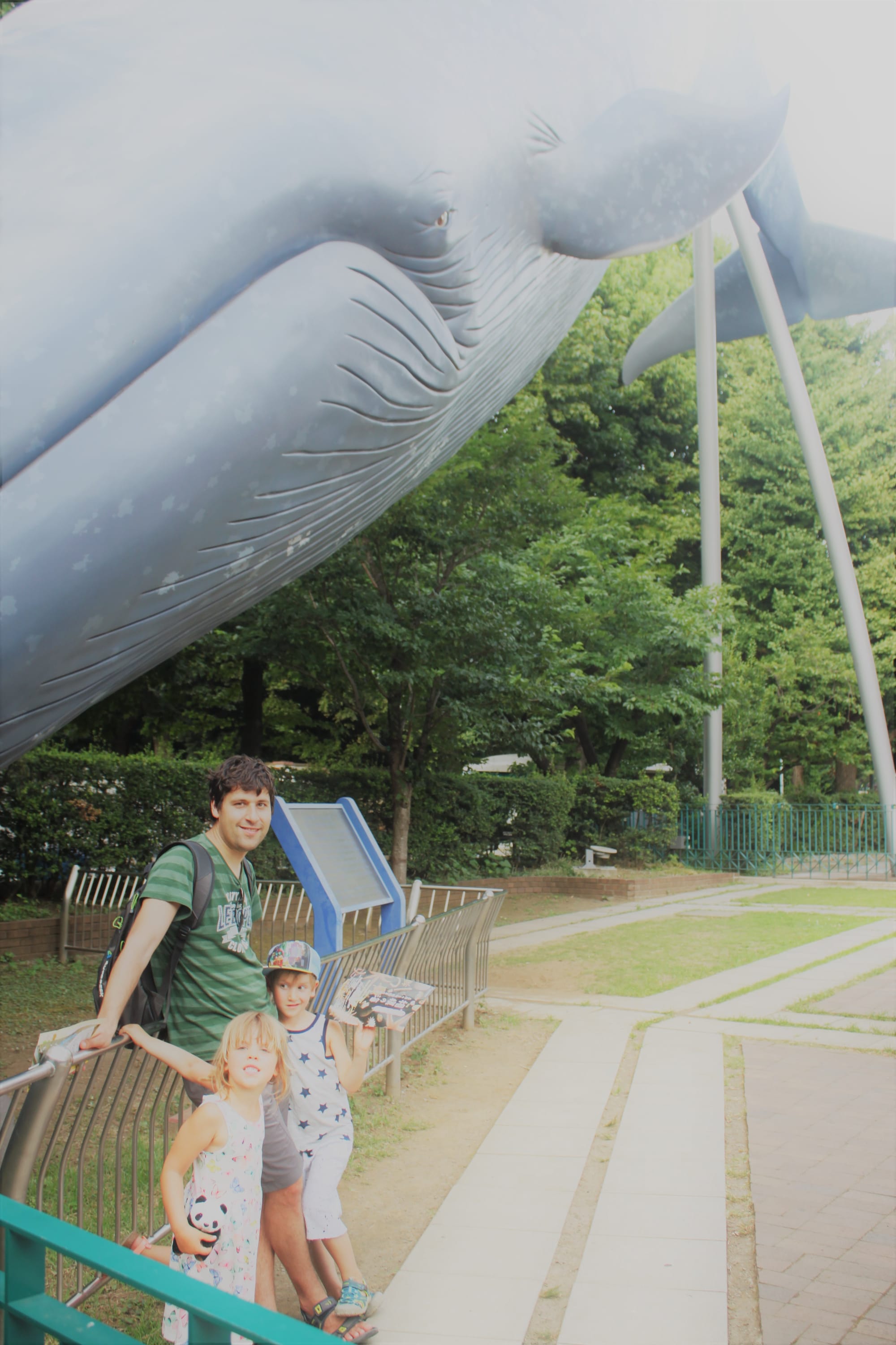 Prie muziejaus buvo tikro dydžio banginio skulptūra. Išlindom iš ten jau vakarop ir tada vaikai pamatė fontaną, į kurį lipo atsivėsinti (mes nežinojom, kokios taisyklės dėl to yra šioje taisyklėmis besivadovaujančioje šalyje, bet leidom, kai pamatėm kelis vietinius ibridusius irgi), taip pritraukdami aplinkinių dėmesį ir net fotografę, nes finale jie buvo šlaput slaputėliai, kad reikėjo viską gręžti ir nesėsti traukiny ant kėdės grįžtant, nes gali likti bala.
