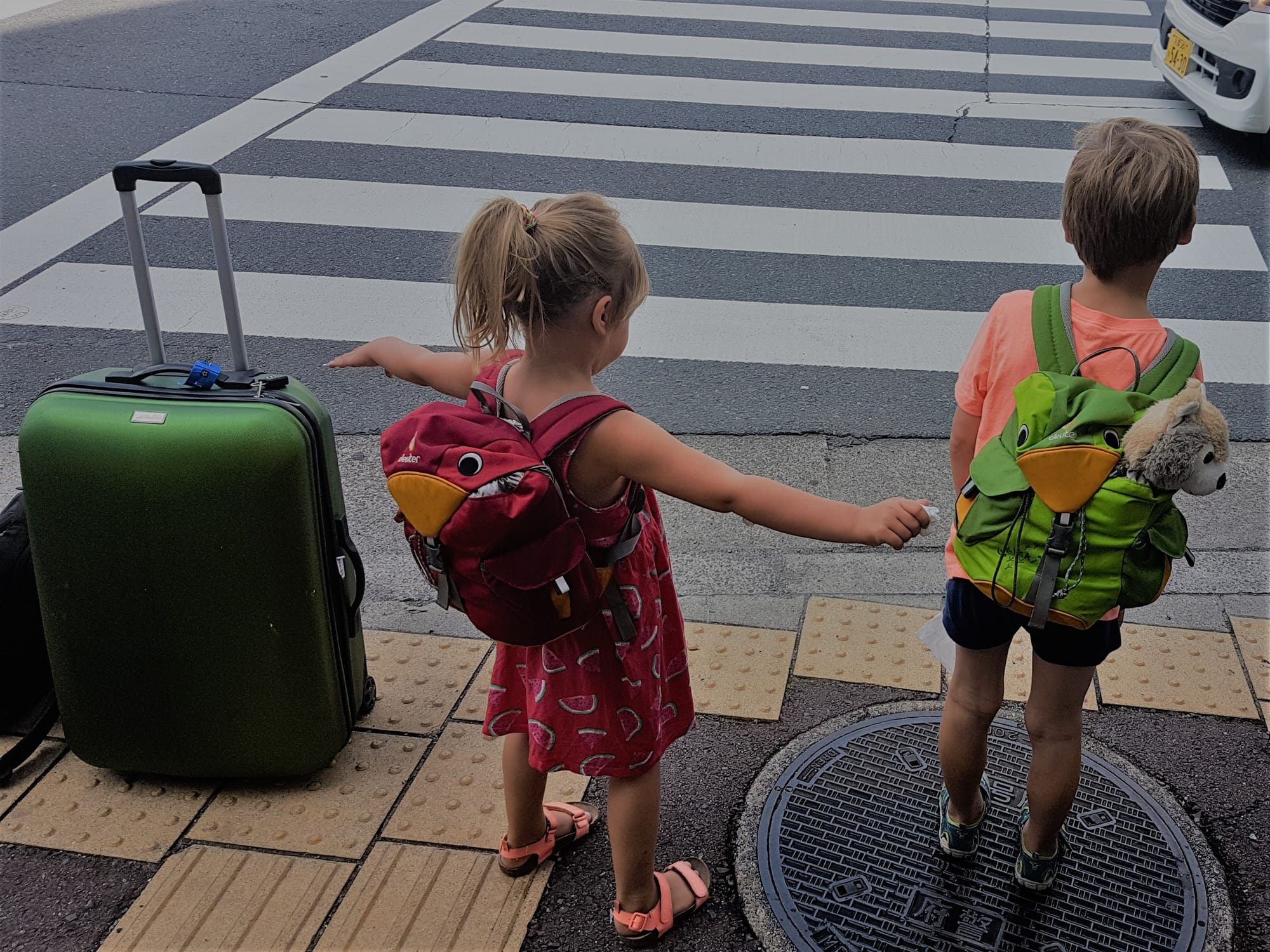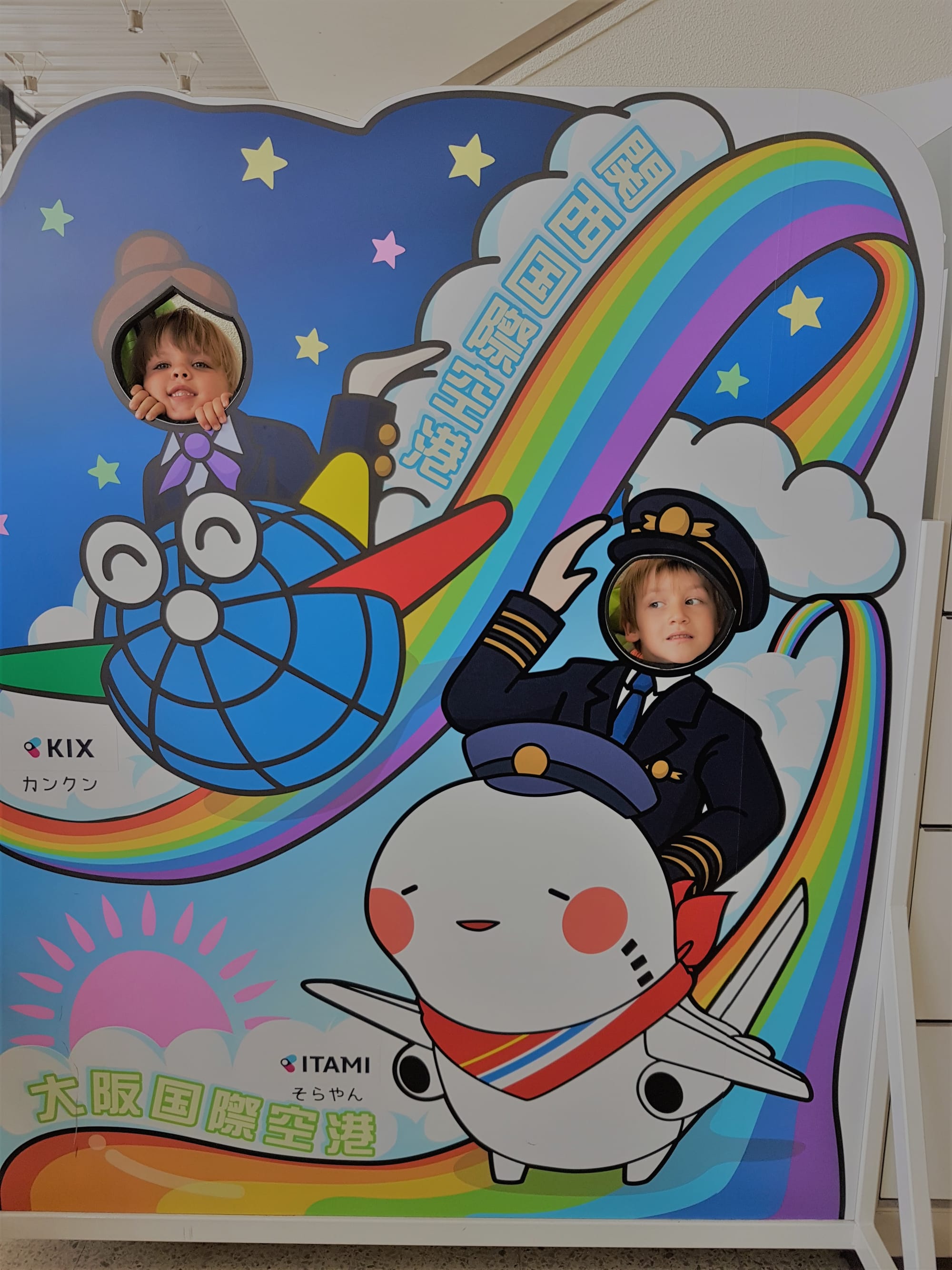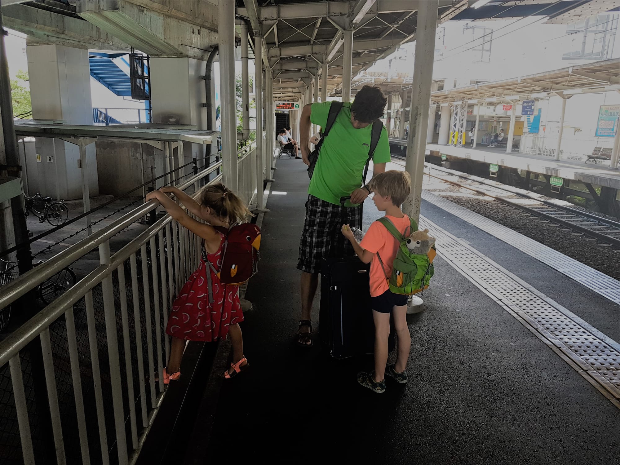 Aštuntoji kelionės diena praktiškai buvo skirta kelionei iš Kyoto į Osaką traukiniu ir tada iš Osakos į Nahos miestą Okinawos saloje lėktuvu. Vaikai jau taip pripratę prie kasdienių kelionių, kad be jokių zyzalų dedasi kuprines ant pečių, duoda ranką (jei mes turim laisvų) ir keliauja, kur liepiam. Bet kai nuvargsta arba išalksta, amžinai susimuša - kuris įmes pinigą į automatą, kuris paims bilietą, kuris kur traukiny atsisės ir t.t. Tas labai nervina, ypač dideliame ir karštame mieste, kai mes, tėvai, susirūpinę, kad jų nepamesti, kad jie neiškeptų, daug gertų ir valgytų. Tai tos smulkmenos ir pykčiai mums su Justu tik prideda papildomų raukšlių veiduose. BET, nė minutės nesigailėjome, kad leidžiamės į keliones su jais, kad ir kaip nelengva kartais būtų. Visos kelionės metu nesutikom jokios šeimos, keliaujančios po Japoniją su tokiais mažais vaikais. Tereikia pamatyti Džiugo akis, kai pamato vabalą, kokio Europoj nebūna ir supranti, kad buvo verta.