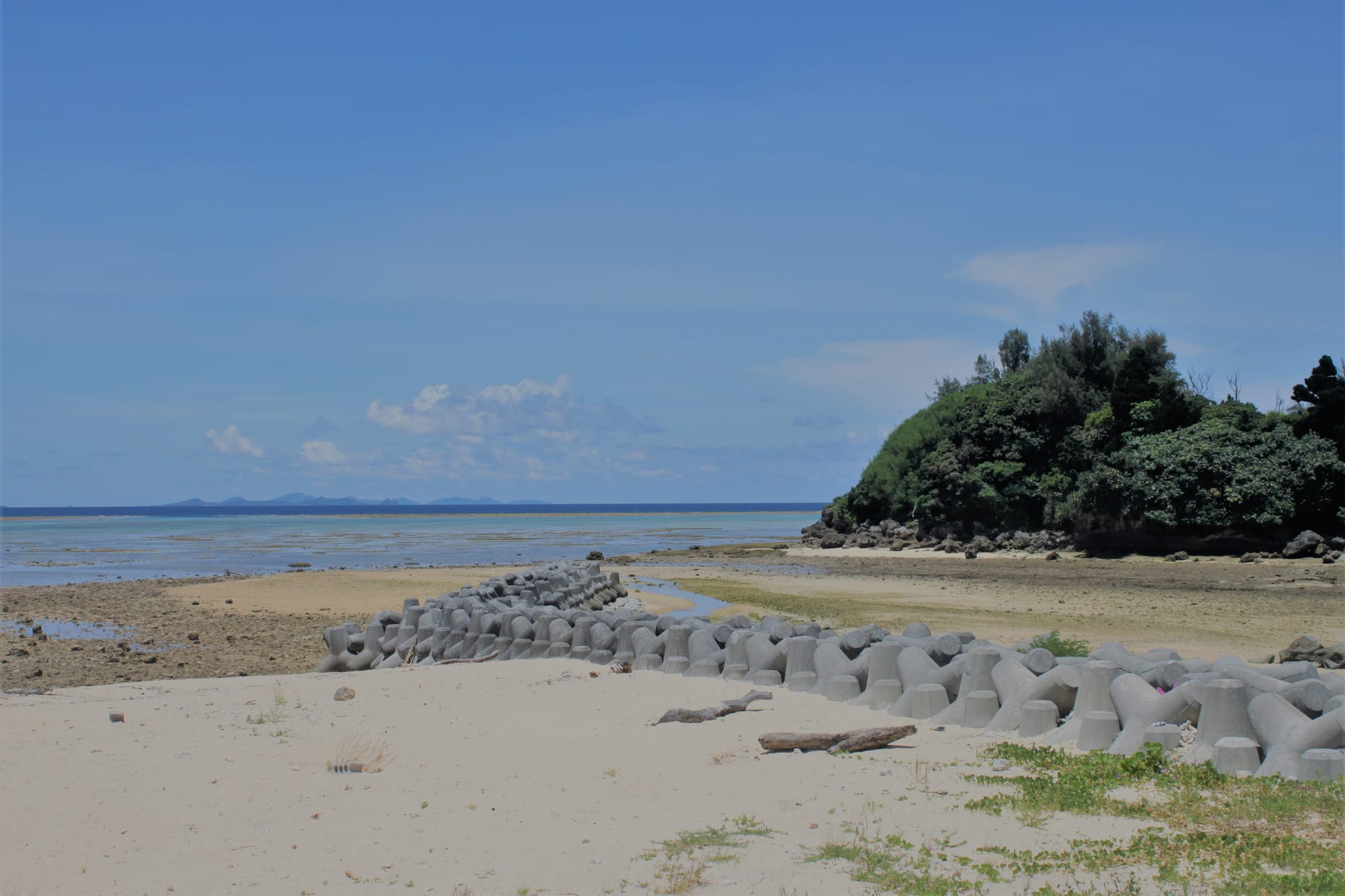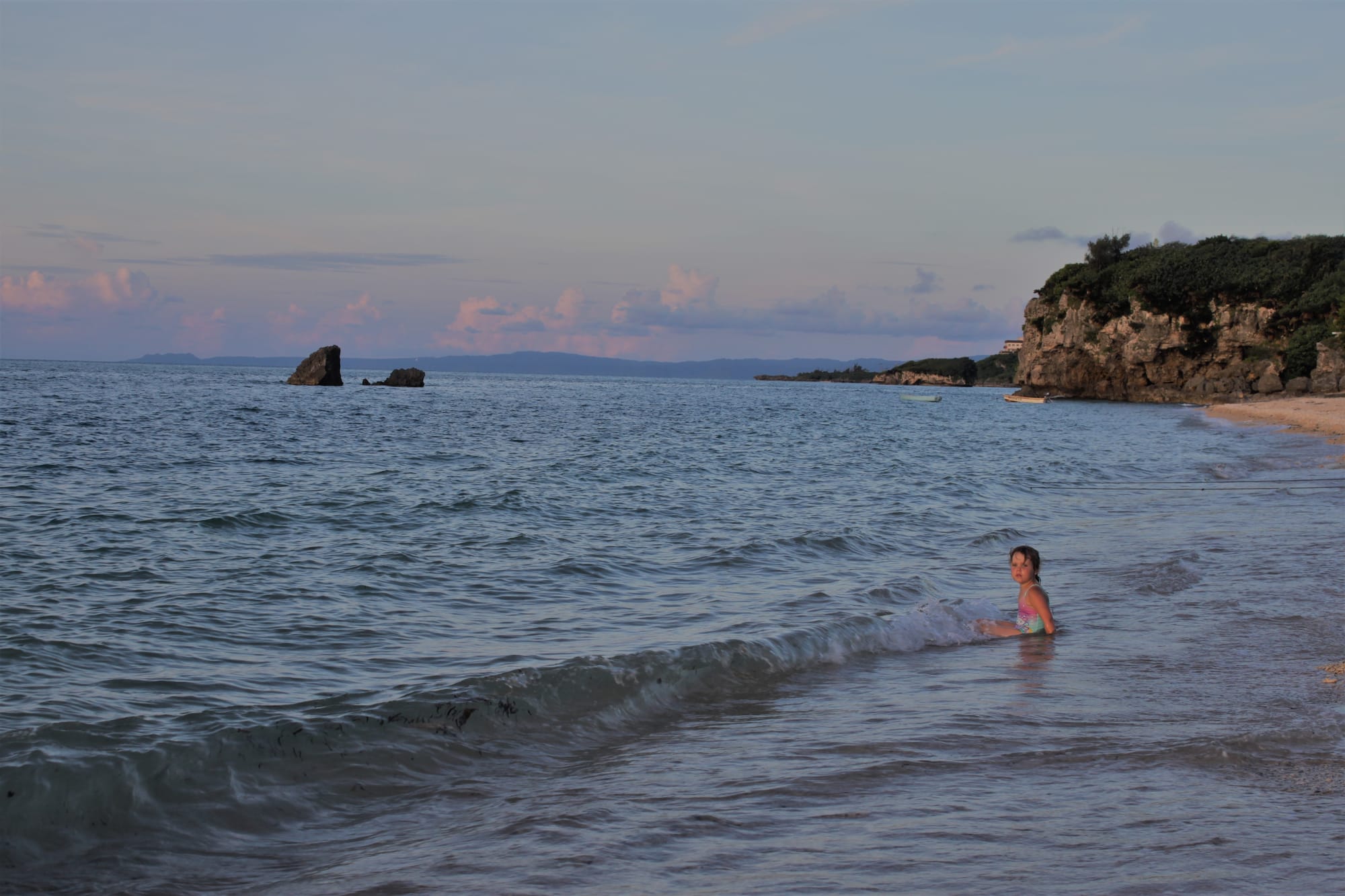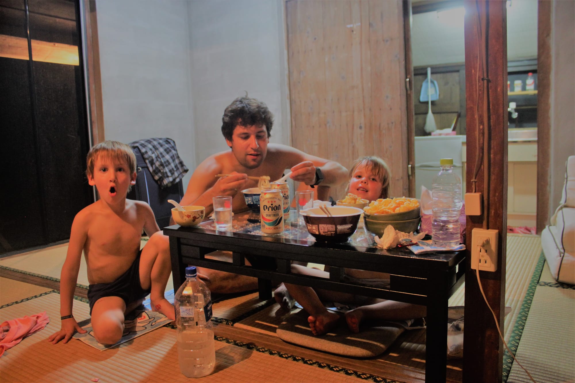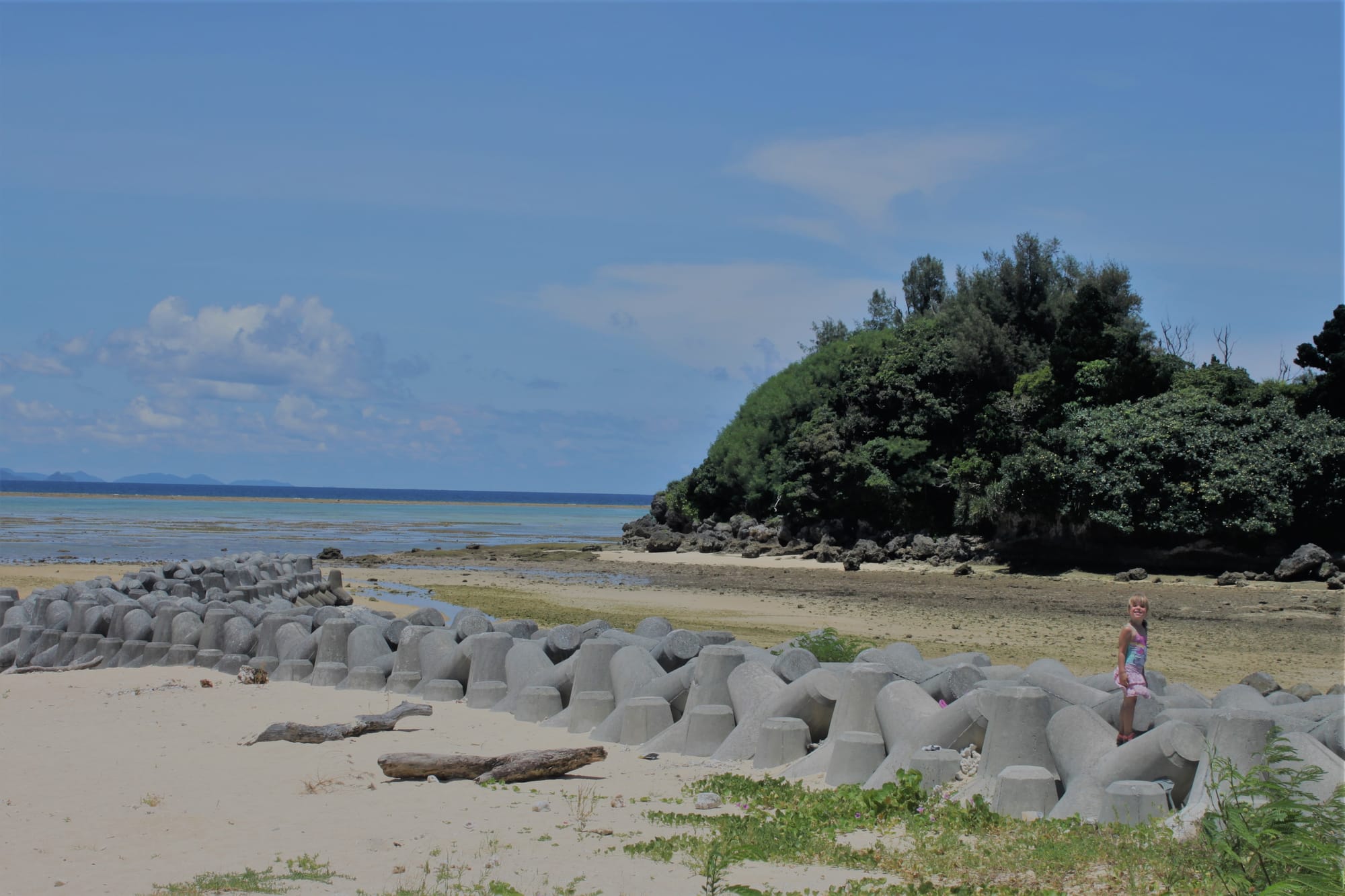 Ryte ištroškę jūros tiesiu taikymu ten varėm, šis salos krantas yra skalaujamas Rytų Kinijos jūros ir praktiškai Ramiojo vandenyno. Artimiausias paplūdimys nuo namelio yra už penkių minučių kelio pėsčiomis, bet nuėję pamatėme žiauriai nusekusią jūrą, kurioje nebuvo įmanoma maudytis, tik vaikštinėti po išlindusius koralus ir ieškoti visokių krabų ir jūros žvaigždžių, kas vyrams tiko, o mes su Emile ėjom patikrinti kito greta esančio paplūdimio, bet ten buvo tas pats. Emilė taip sukaito, kad be jokių cypavimų lindo po lediniu dušu namelyje.