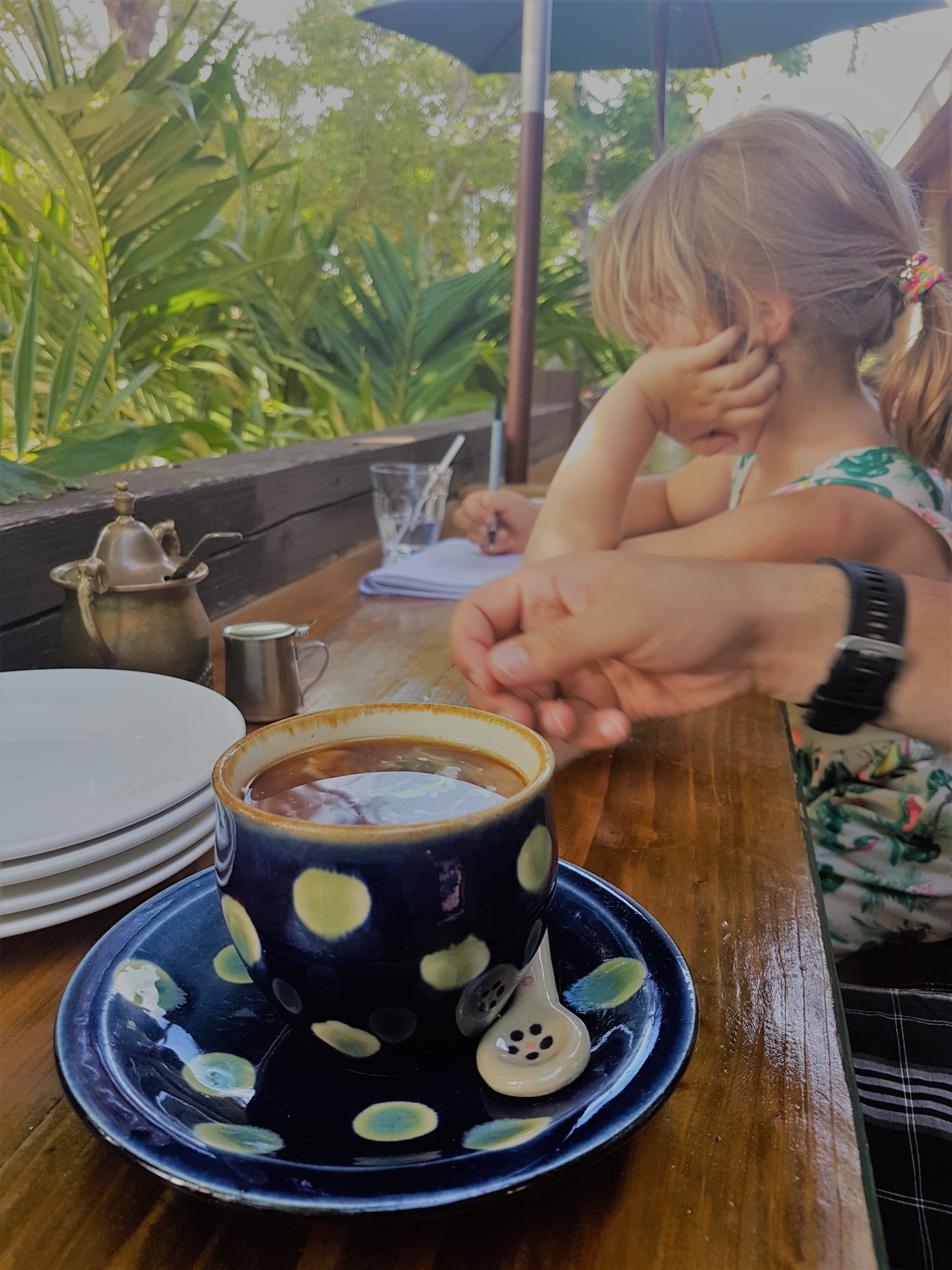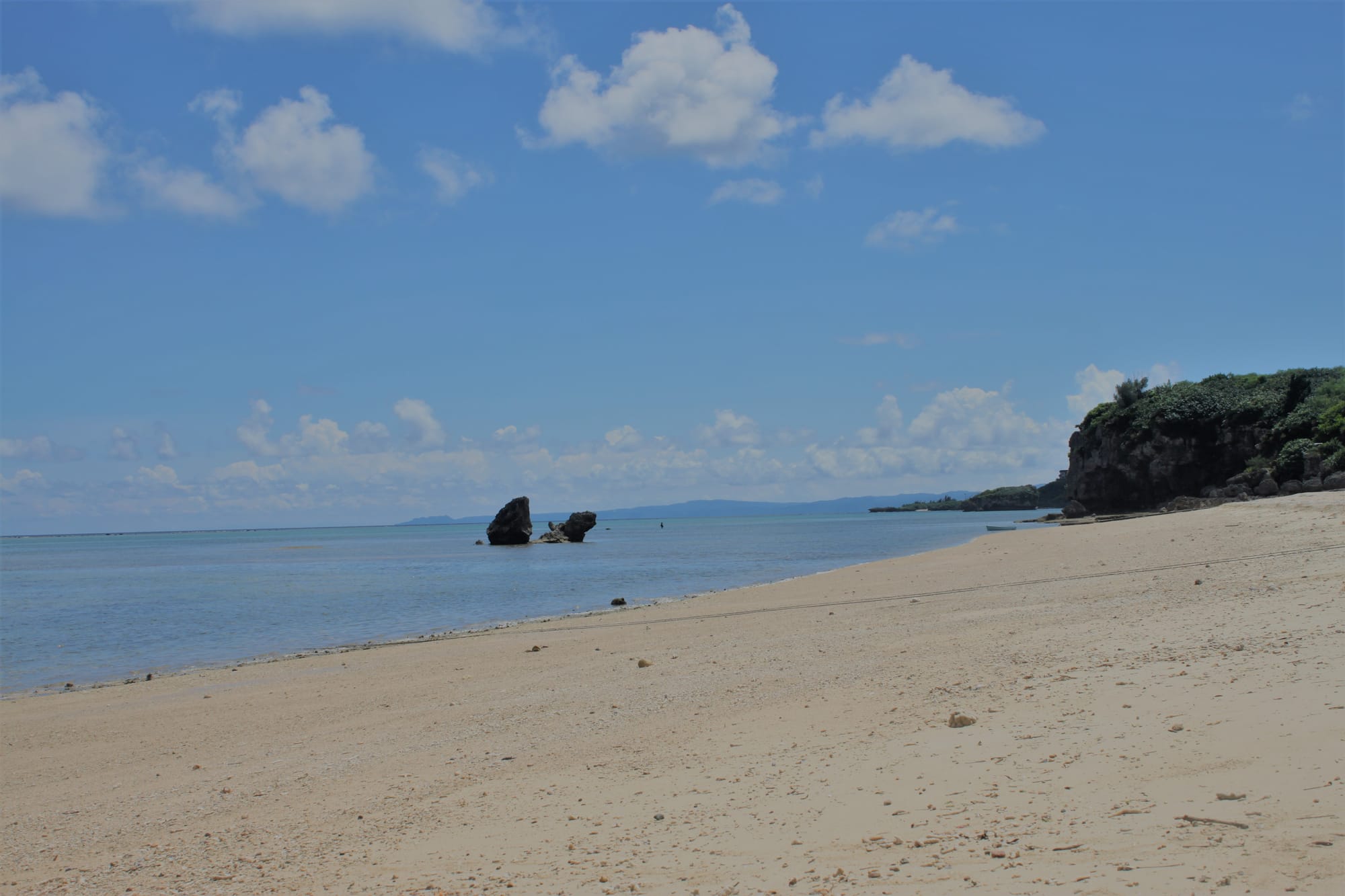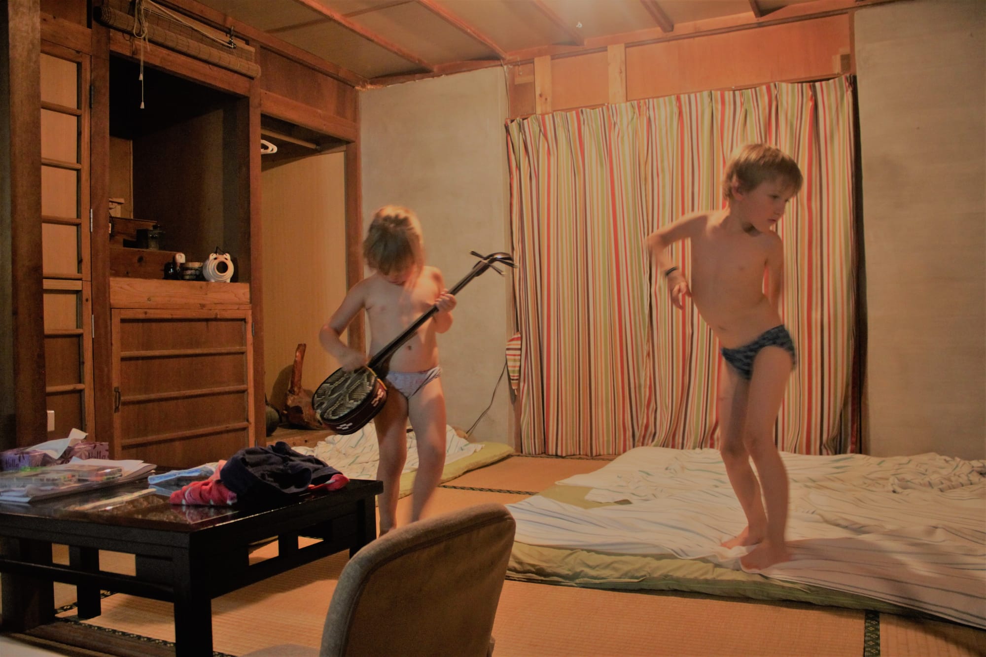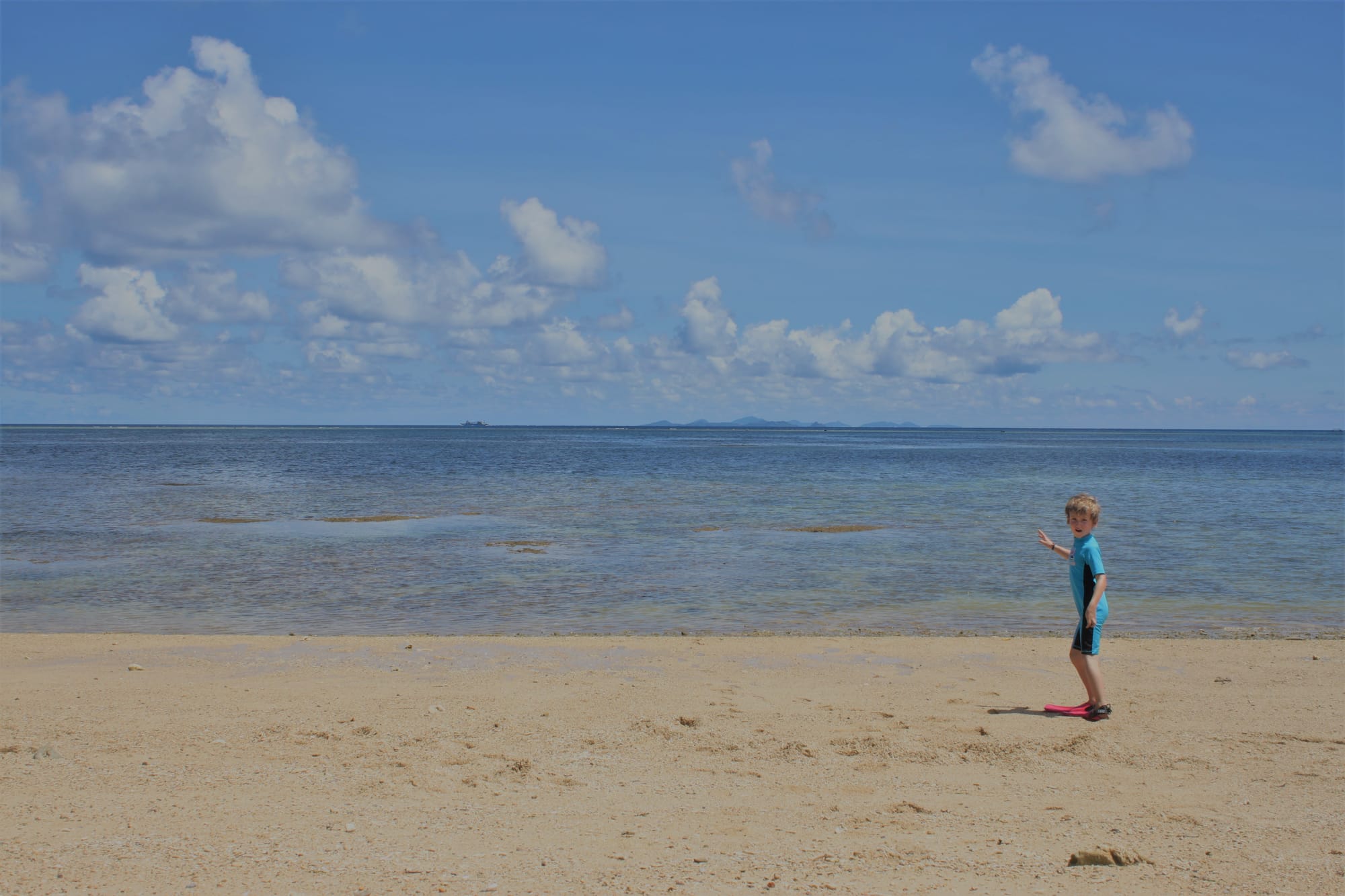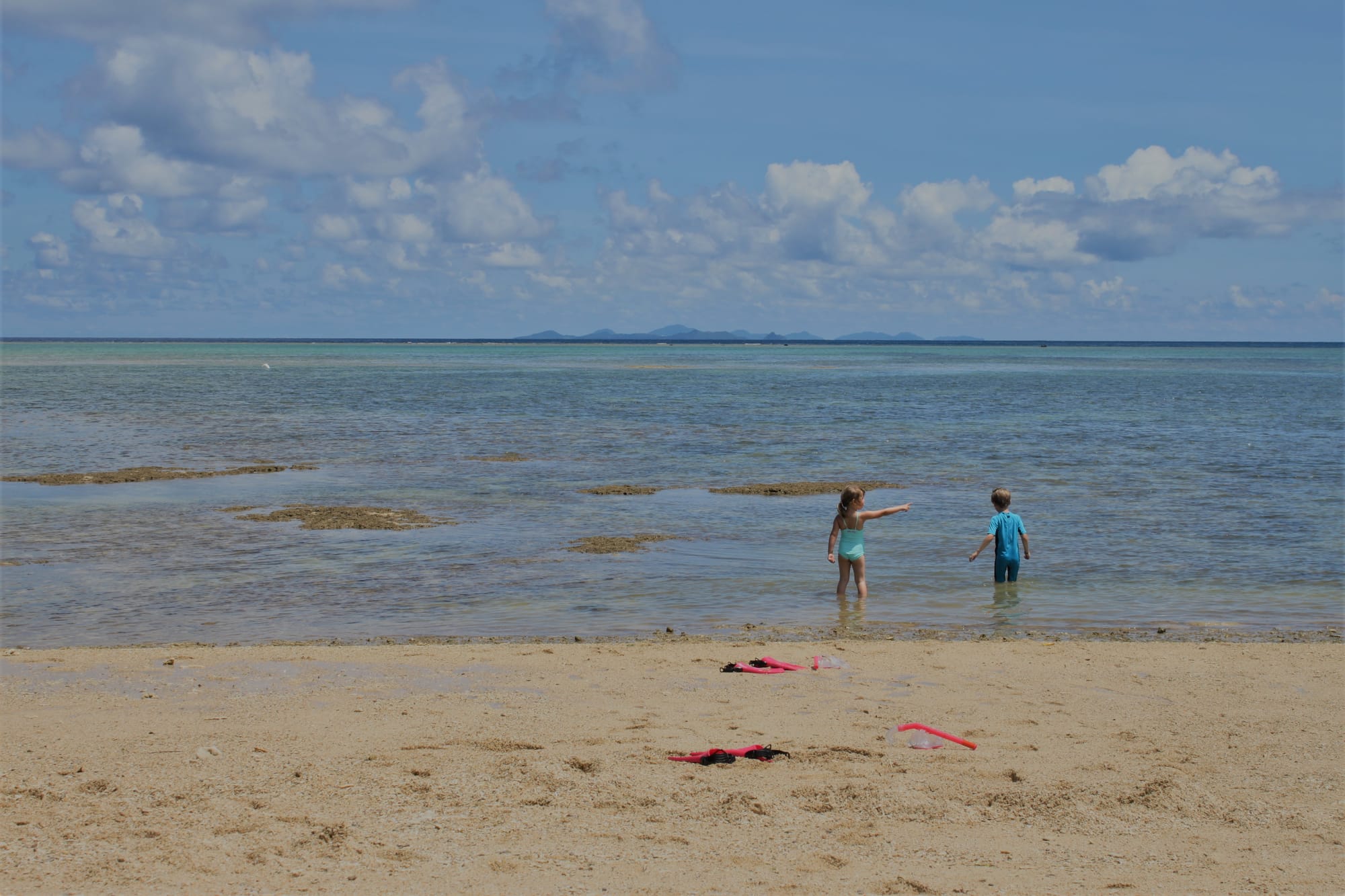 Ryte ištroškę jūros tiesiu taikymu ten varėm, šis salos krantas yra skalaujamas Rytų Kinijos jūros ir praktiškai Ramiojo vandenyno. Artimiausias paplūdimys nuo namelio yra už penkių minučių kelio pėsčiomis, bet nuėję pamatėme žiauriai nusekusią jūrą, kurioje nebuvo įmanoma maudytis, tik vaikštinėti po išlindusius koralus ir ieškoti visokių krabų ir jūros žvaigždžių, kas vyrams tiko, o mes su Emile ėjom patikrinti kito greta esančio paplūdimio, bet ten buvo tas pats. Emilė taip sukaito, kad be jokių cypavimų lindo po lediniu dušu namelyje.