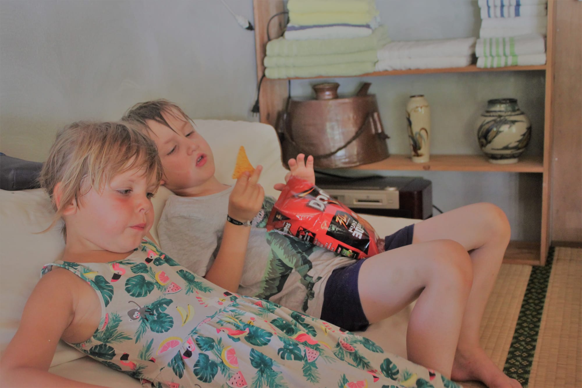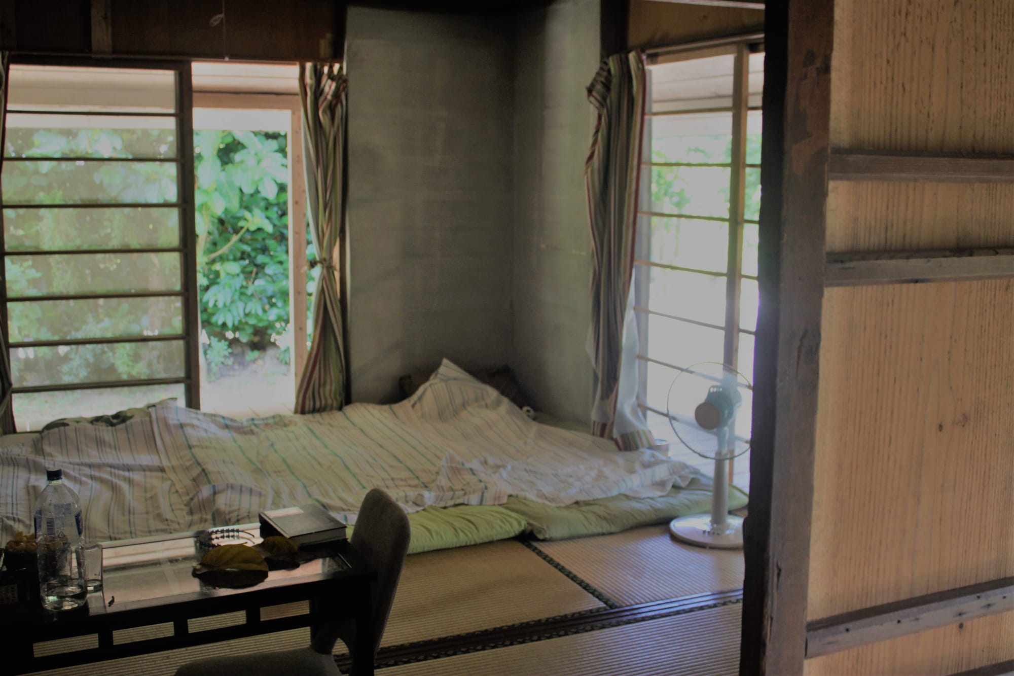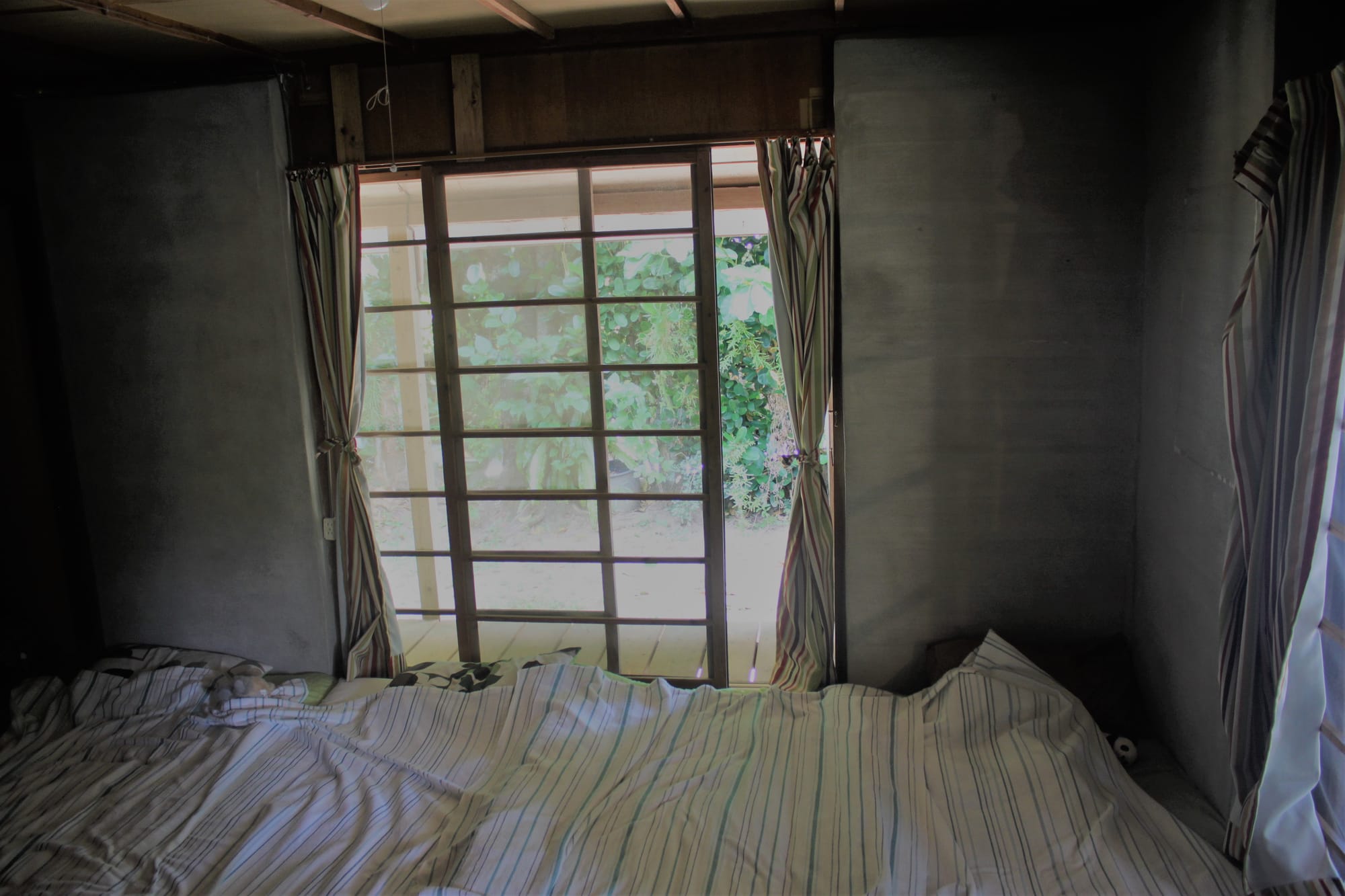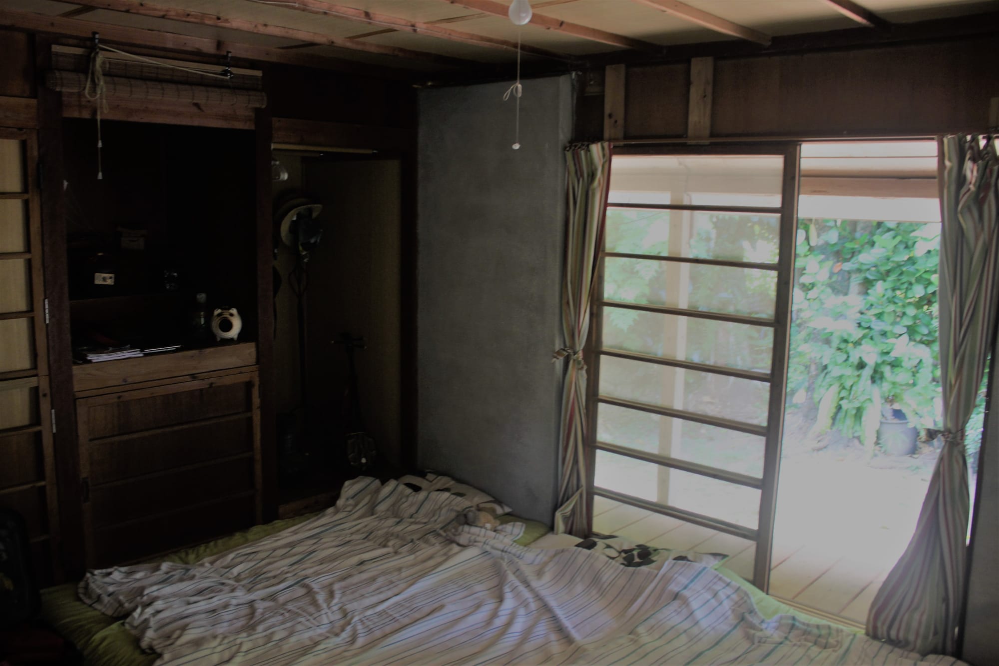 Gyvename per AirBnb rastame namelyje, kuris yra visiškai tradicinis salos gyventojų būstas nuo seniai seniai. Be interneto, be teliko, be kondocionieriaus, be veidrodžio. Tikros atostogos! Namelis tikrai fainas, jaukus, miegama yra ant žemės, kaip senais laikais, o valgoma prie stalo, prie kurio sėdima irgi ant žemės. Yra virtuvė, tualetas, dušas lauke, į kurį aukštaūgiam žmogui nėra lengva patekti. Yra viskas, ko mums, paprastiems keliautojams, tereikia, bet naktį karštoka. Susistatę abu "vėjelius" per kelias naktis gal priprasim.