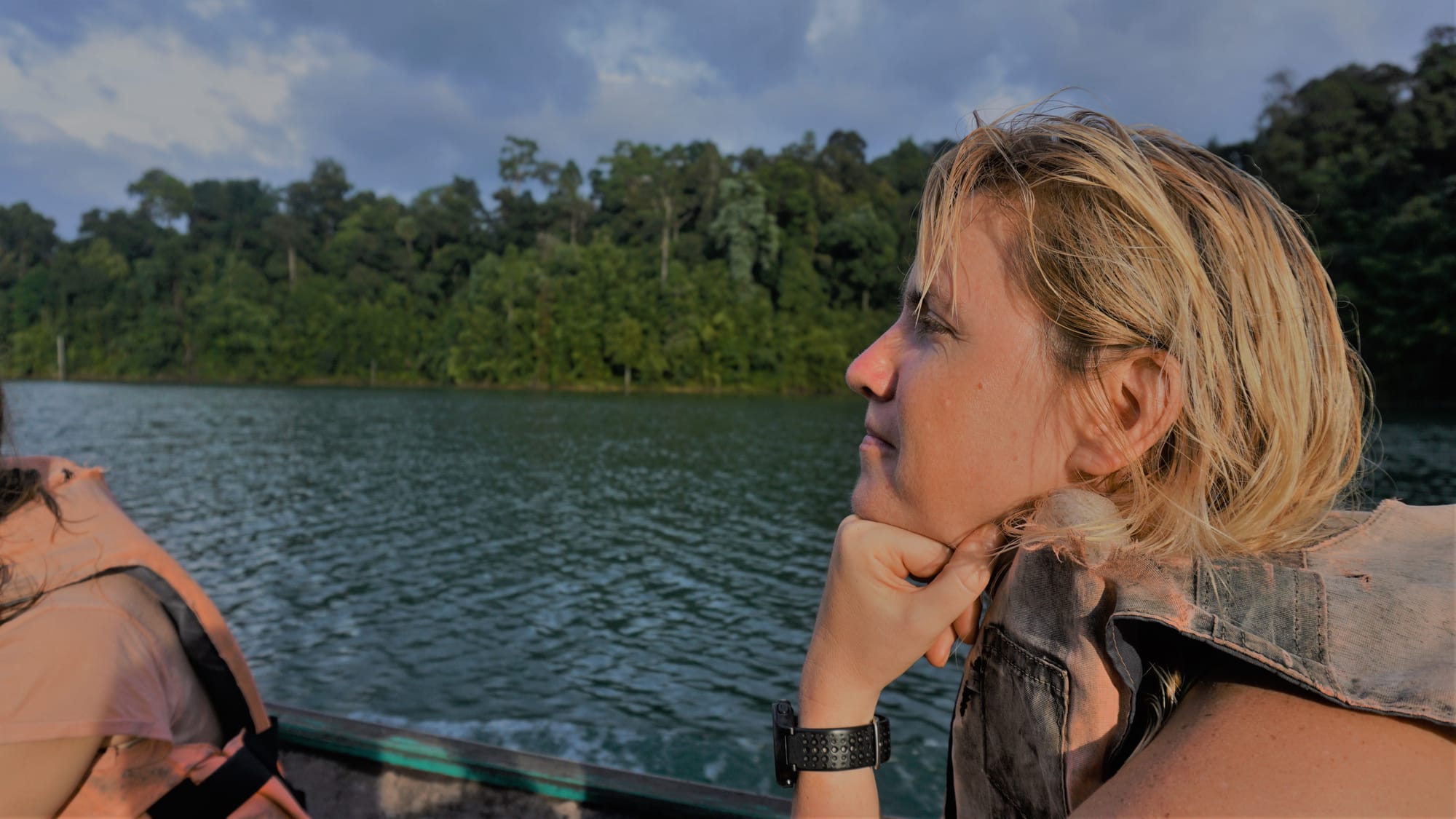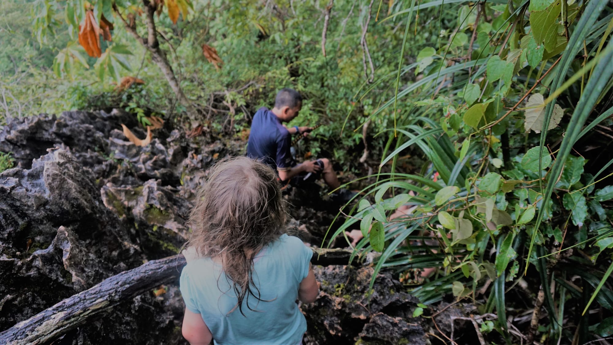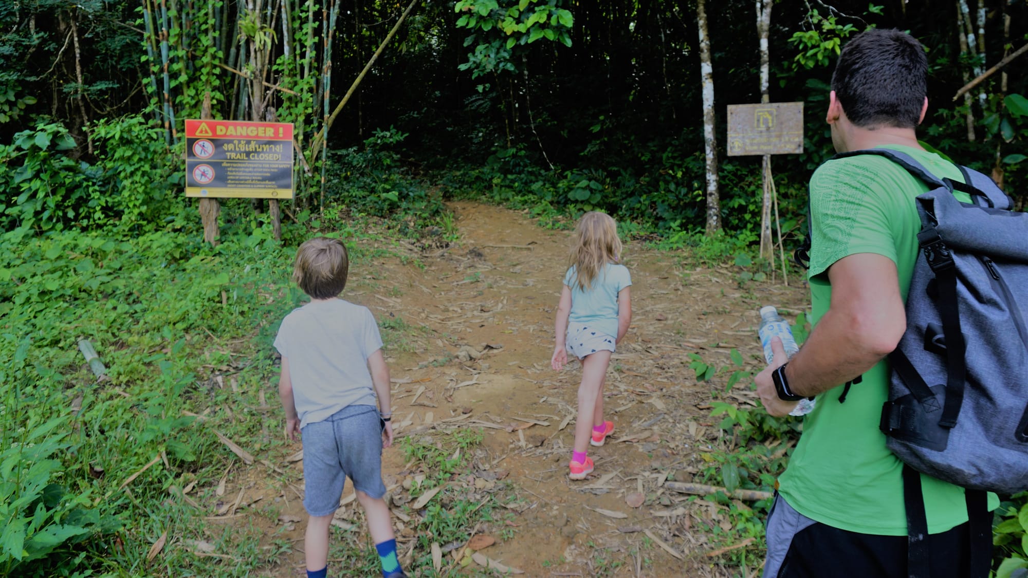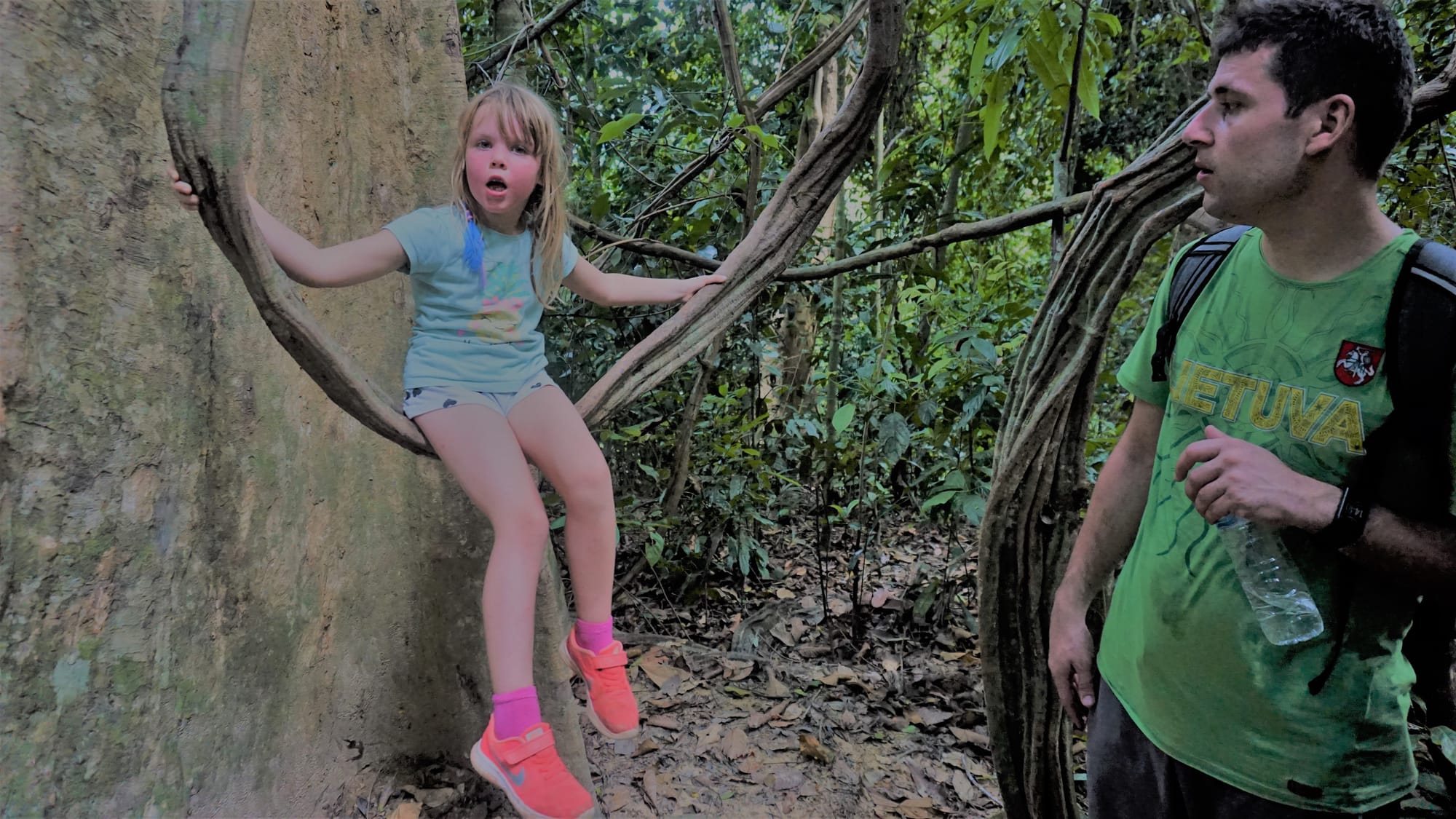 Žygis nebuvo ilgas, apie 1,5 km ilgio, lengvesnis nei patyrėme prieš kelias dienas, bet gana kupinas iššūkių dėl lietaus ir po to likusių šlapių akmenų ir dangos. Kaip gidas sakė, Emilė buvo pati mažiausia per visą laiką užkopusi iki pat viršaus, nes vaikai jau ten paprastai nebekopia finalinės dalies. Paskui plaukėme atgal pasižvalgydami į beždiones ir paukščius, kur išsimaudėme ežere. Jis, beje, visur yra apie 100-200 metrų gylio, tad būtinos liemenės.