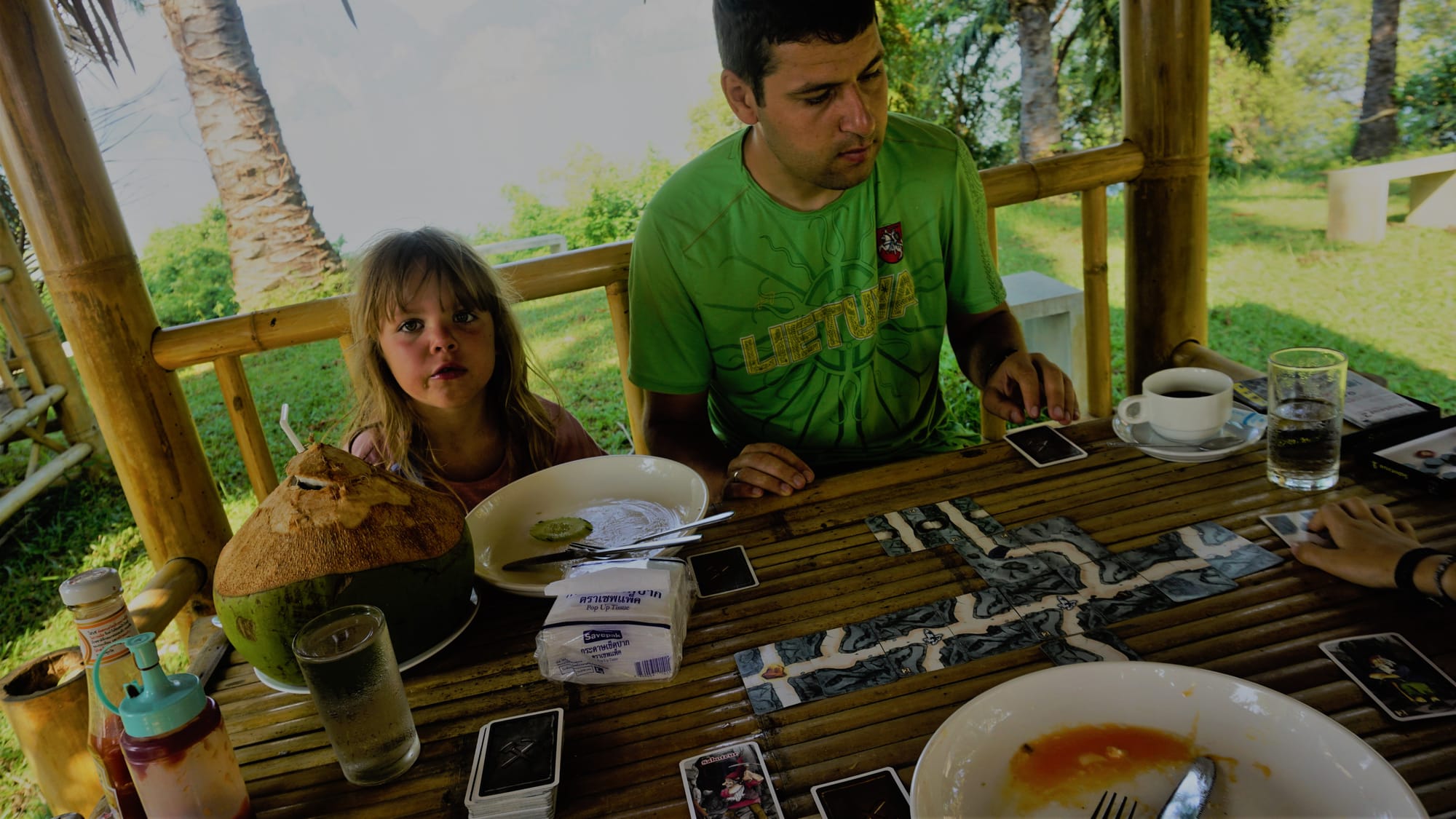 The 15th day of the trip is always hard for us. This is the point of the holidays, when we are exhausted of travelling and adventures and a little bit tired of each other. So, me and kids stayed in the air-conditioned room of wasana resort on that day. We were talking, laughing and playing board games. Justas visited one more waterfall. Later that evening, we drove to one of the beaches, but it was not very good. When going back we saw how a trained monkey is collecting coconuts from the top of the palm tree. Justas told us that they are doing that but we believed only when saw by ourselves. Only five photos 😄