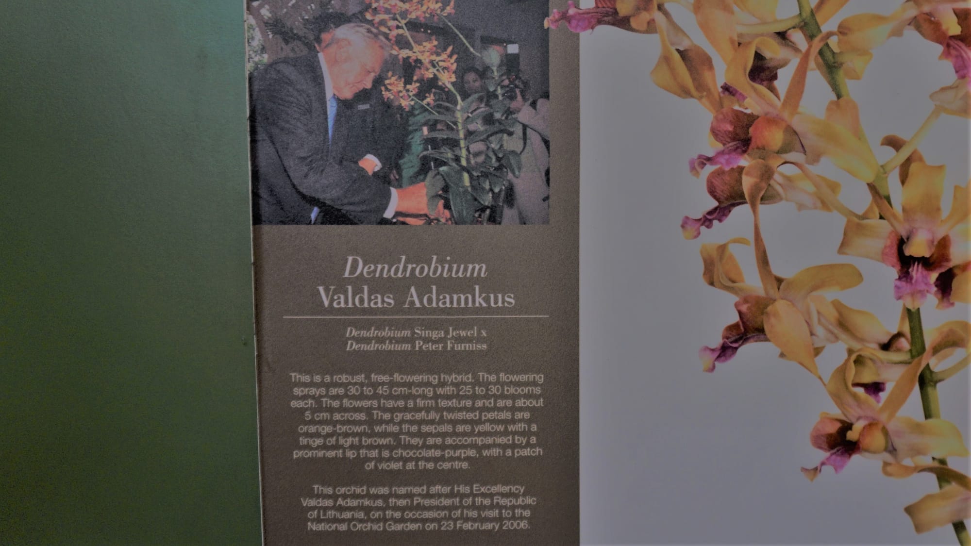 Orchidėjų sodas nedidelis, bet įspūdingas. O viena iš jų rūšių yra nacionalinė Singapūro gėlė. Įdomiausia man buvo tai, kad kiekvieno didingesnio svečio garbei jie išveda orchidėjų rūšį, tad radau, kad Valdas Adamkus lankėsi Singapūre 2006aisiais, aplankė Botanikos sodą ir turi savo gėlę ten.