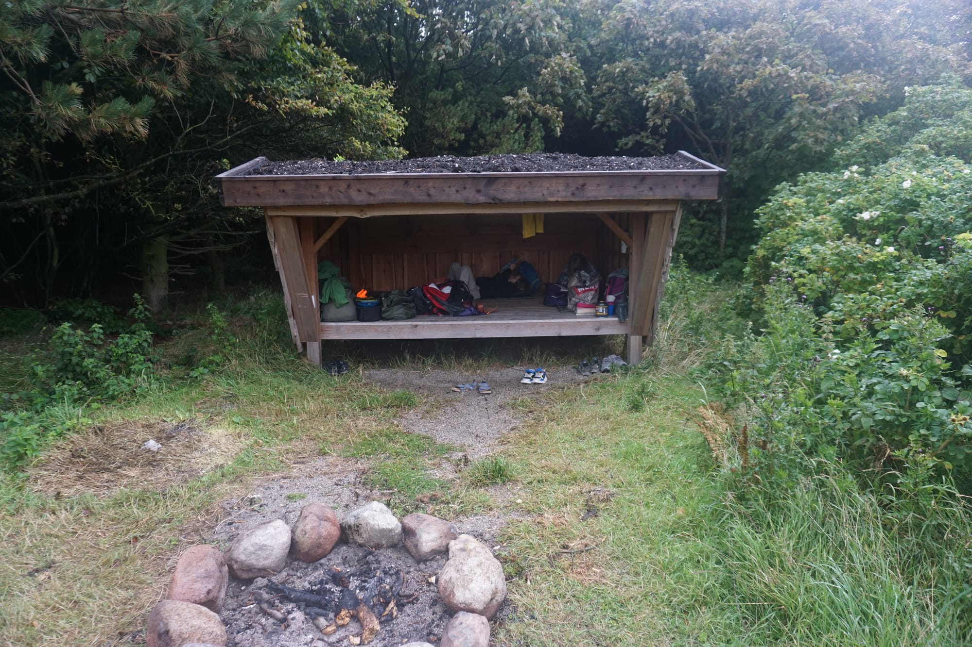 Pirmąją nakvynę suplanavome Jelling miestelyje, pora kilometų nuo traukinių stoties. Nakvynės mūsų buvo suplanuotos tik tiek, kad jos bus netoli traukinio ir miške. Čia, Danijoje, yra nemažai vietų, kuriose pastatytos mažos pašiūrės nakvojimui, tad net nereikia palapinės. Jei užimta, gali laisvai statytis palapinę, naudotis laužaviete, paprastai visur būna vanduo ir bent minimalus tualetas. Tiesa, naktis buvo gana šalta, apie aštuonis laipsnius, tai visi gana sušalome, bet tai buvo vienintelė tokia naktis.