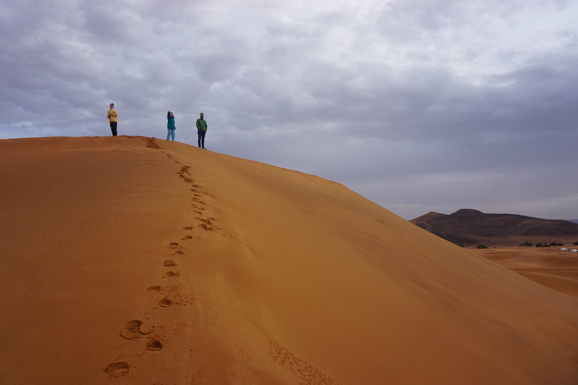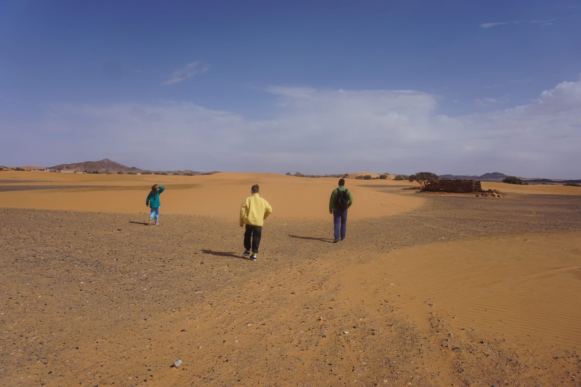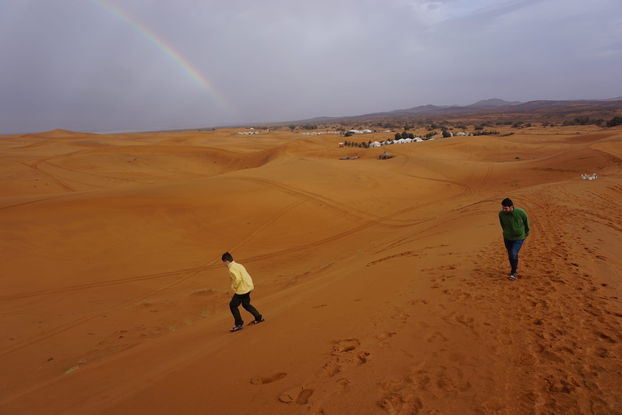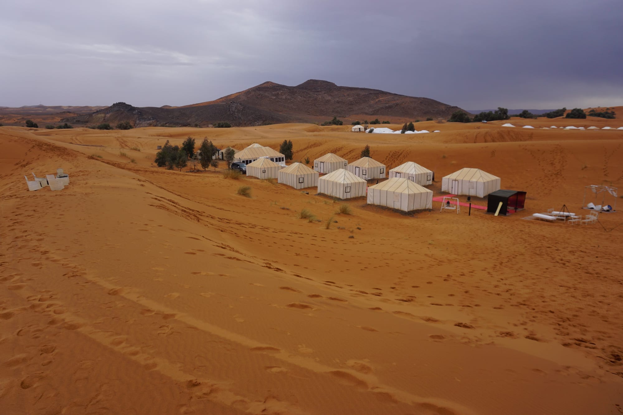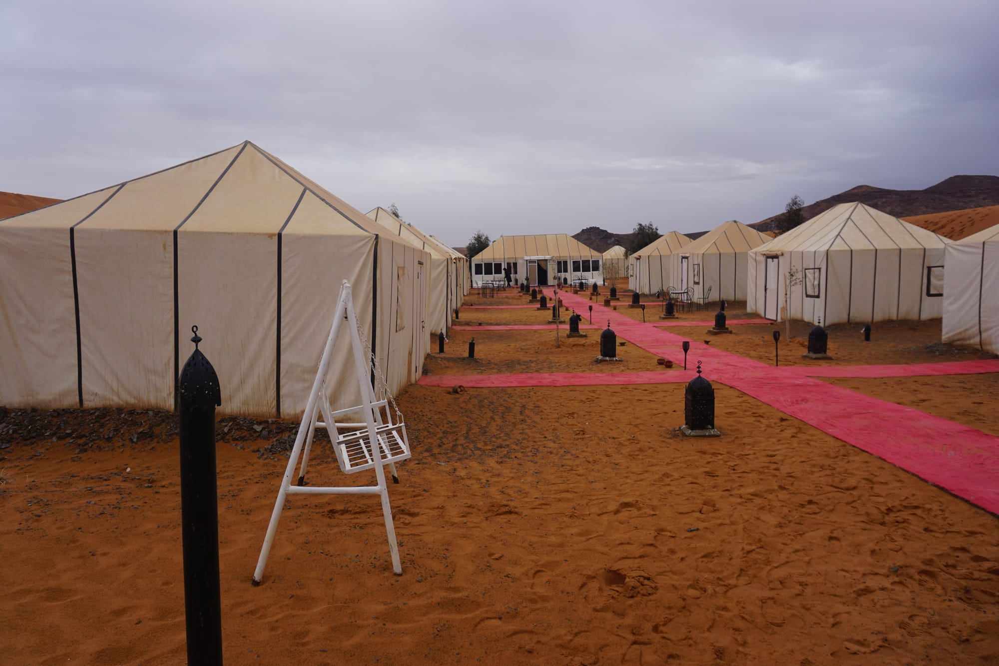 Po iššūkių pilnos kelionės nuo Essouiros iki Merzougos, pagaliau pasiekėme Saharos dykumą. Čia turėjome praleisti dvi naktis, tokioje palapinių stovykloje vidury dykumos, kur palapinės yra su patogiom lovom, dušu, tualetu ir maistu. Labai fainas konceptas, tik šaltoka buvo naktimis. Mus pasitiko Merzourga mieste ir džipu nuvežė apie 4km į dykumą. Ten pirmą vakarą įsikūrėme, pavakarieniavome ir susidėliojome rytojaus planą. Šią dieną dar lynojo, dykuma buvo šlapia ir apniukusi!