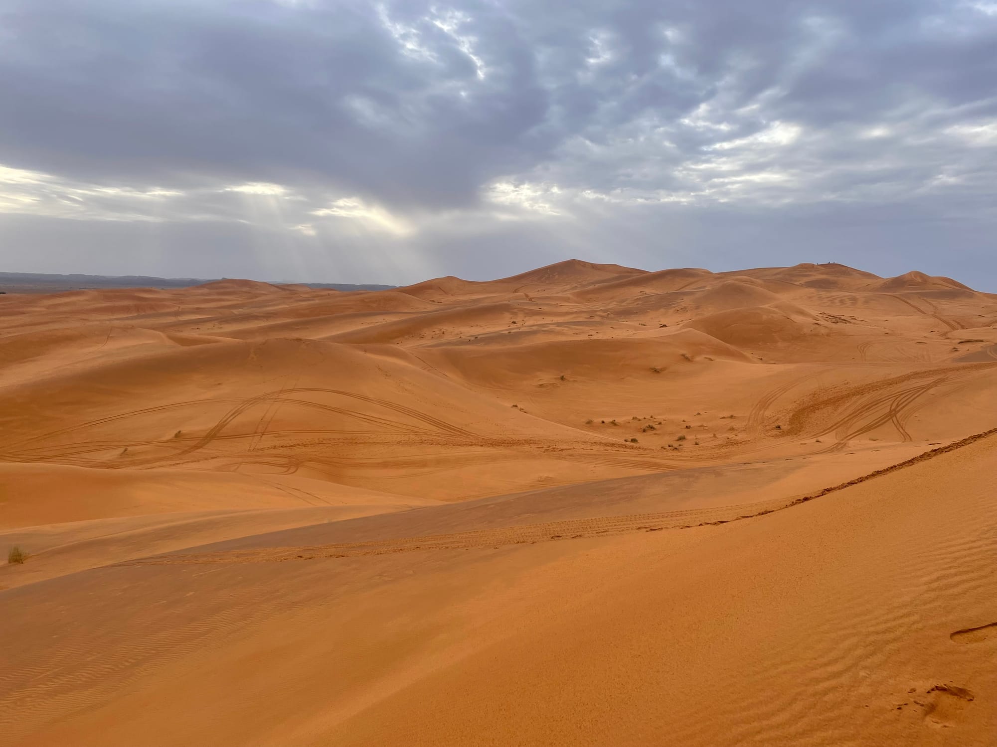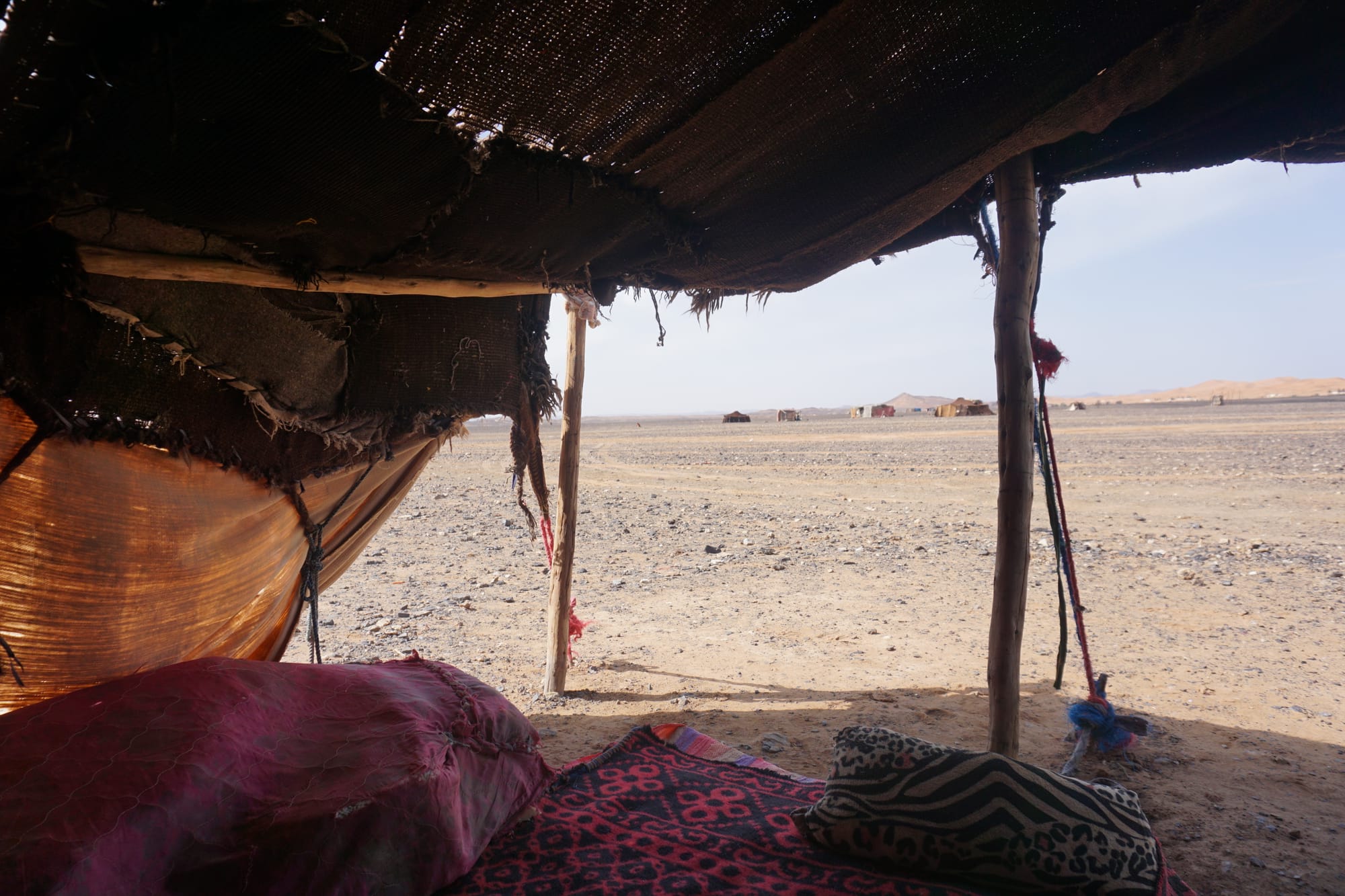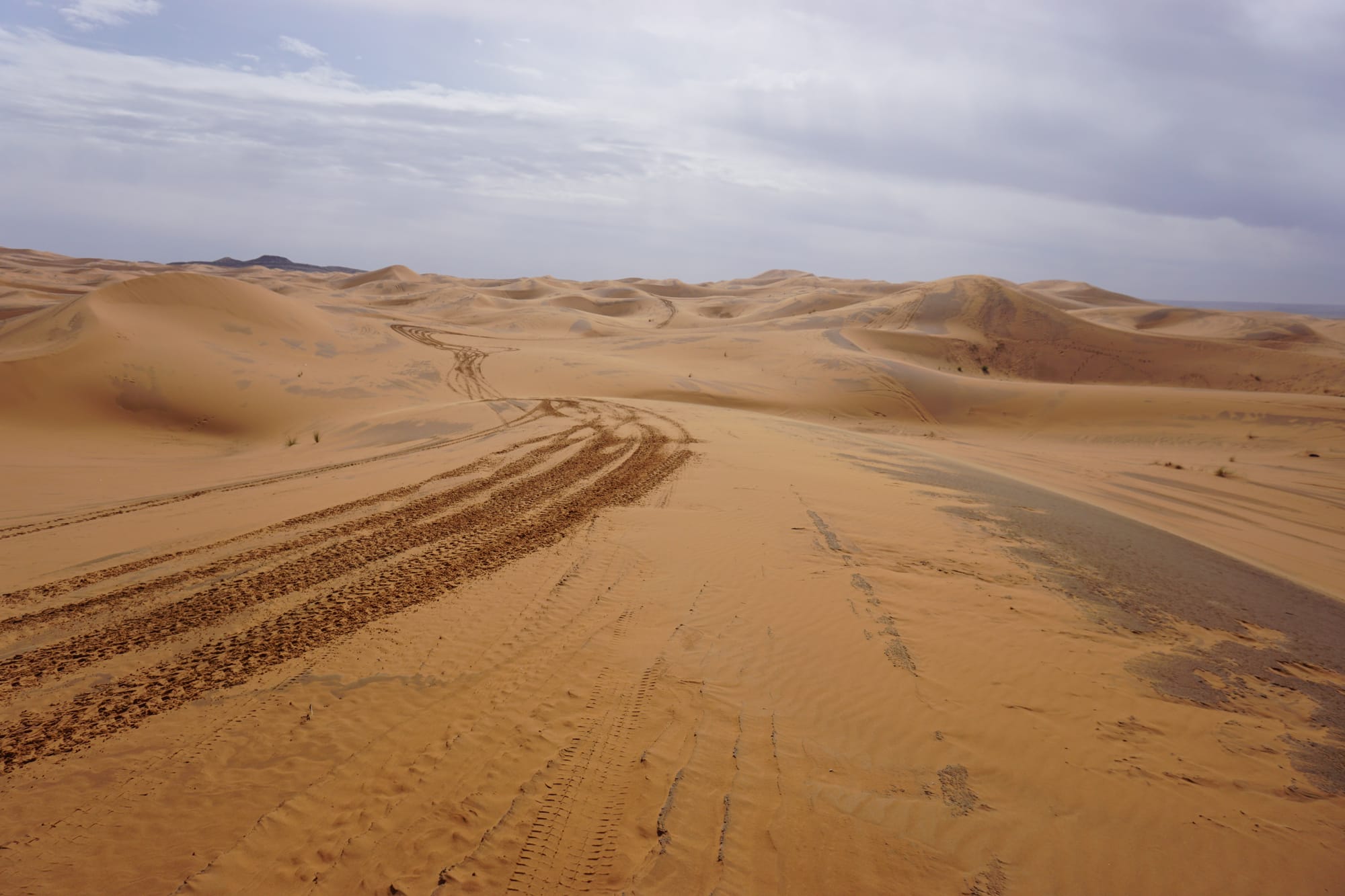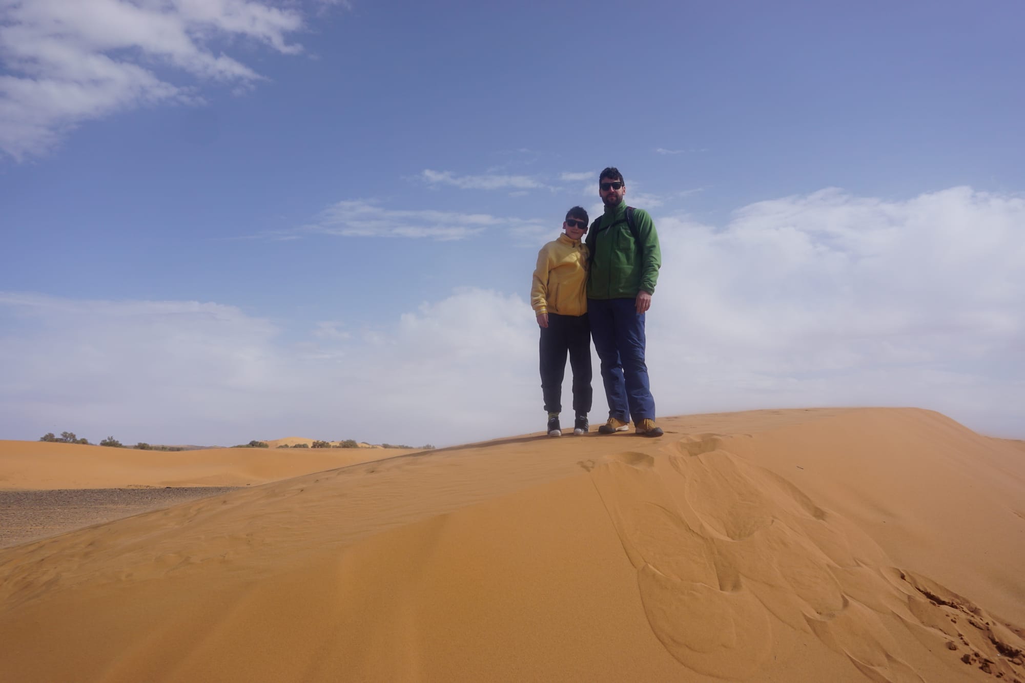 Po iššūkių pilnos kelionės nuo Essouiros iki Merzougos, pagaliau pasiekėme Saharos dykumą. Čia turėjome praleisti dvi naktis, tokioje palapinių stovykloje vidury dykumos, kur palapinės yra su patogiom lovom, dušu, tualetu ir maistu. Labai fainas konceptas, tik šaltoka buvo naktimis. Mus pasitiko Merzourga mieste ir džipu nuvežė apie 4km į dykumą. Ten pirmą vakarą įsikūrėme, pavakarieniavome ir susidėliojome rytojaus planą. Šią dieną dar lynojo, dykuma buvo šlapia ir apniukusi!