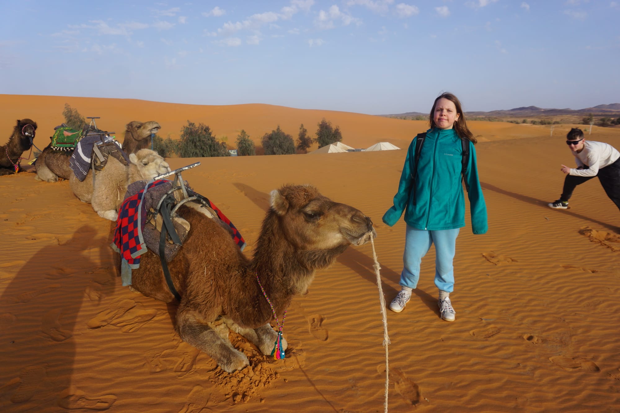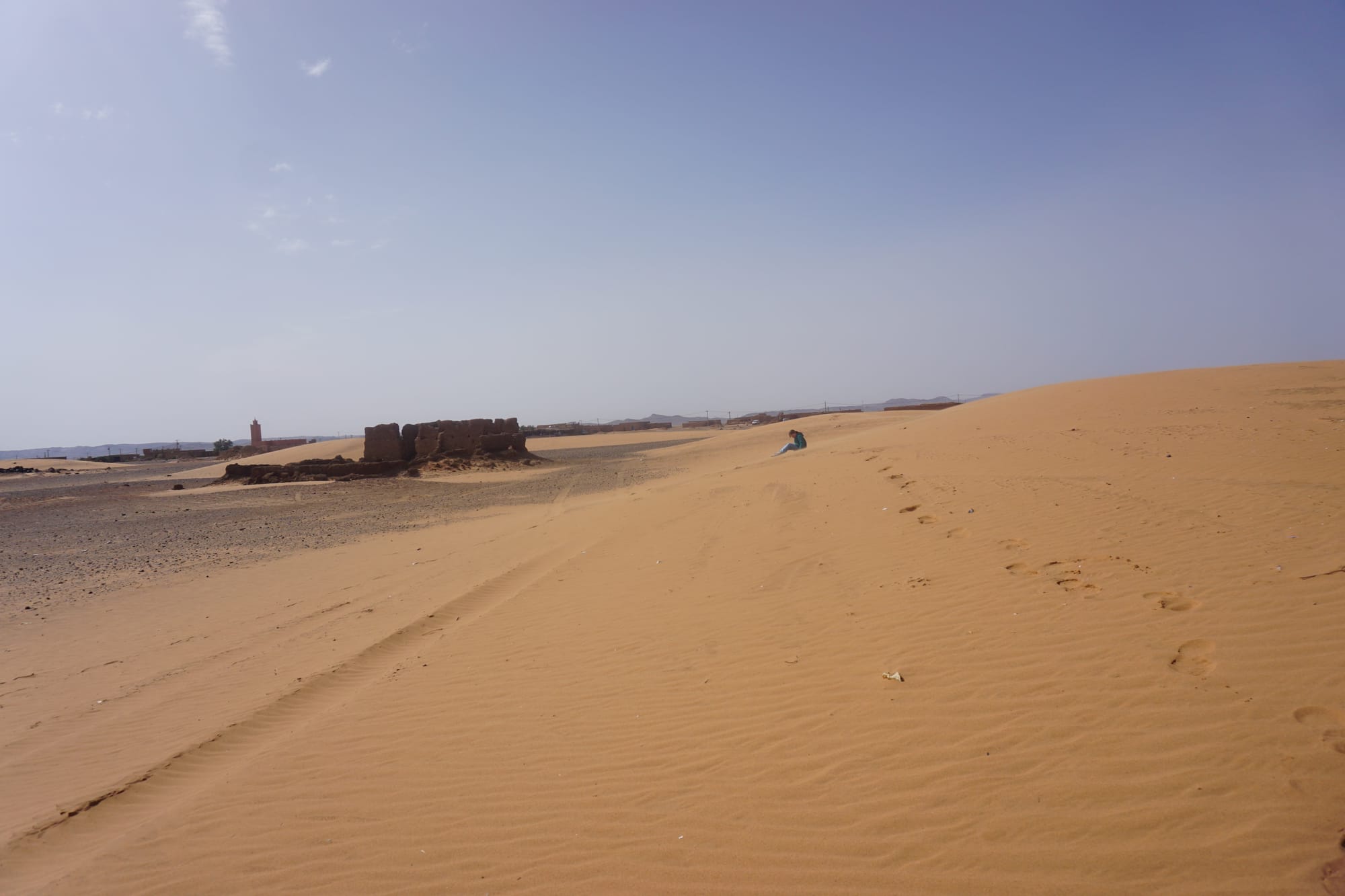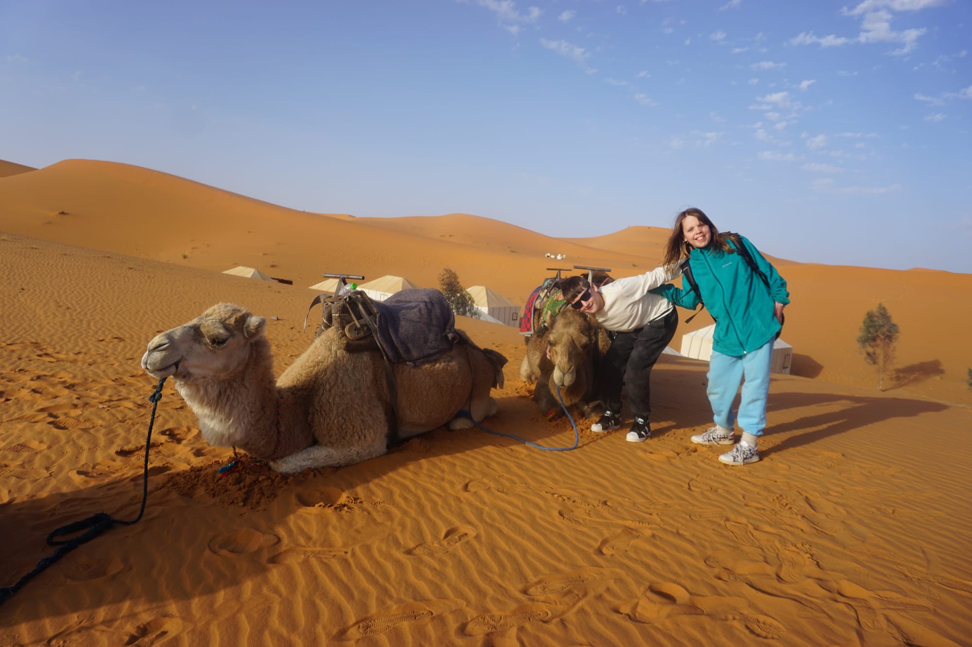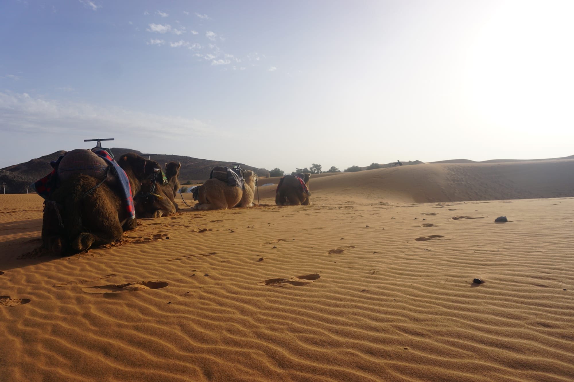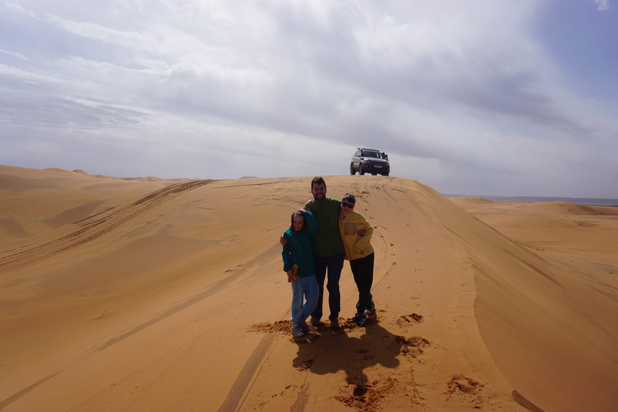 Po iššūkių pilnos kelionės nuo Essouiros iki Merzougos, pagaliau pasiekėme Saharos dykumą. Čia turėjome praleisti dvi naktis, tokioje palapinių stovykloje vidury dykumos, kur palapinės yra su patogiom lovom, dušu, tualetu ir maistu. Labai fainas konceptas, tik šaltoka buvo naktimis. Mus pasitiko Merzourga mieste ir džipu nuvežė apie 4km į dykumą. Ten pirmą vakarą įsikūrėme, pavakarieniavome ir susidėliojome rytojaus planą. Šią dieną dar lynojo, dykuma buvo šlapia ir apniukusi!
