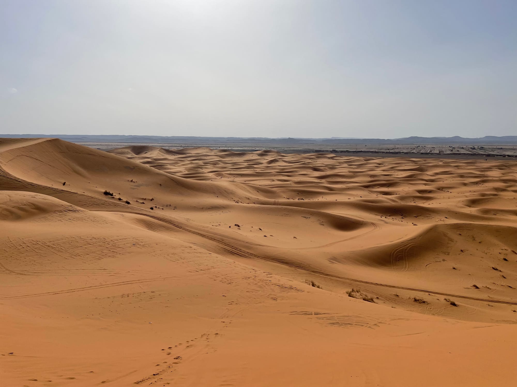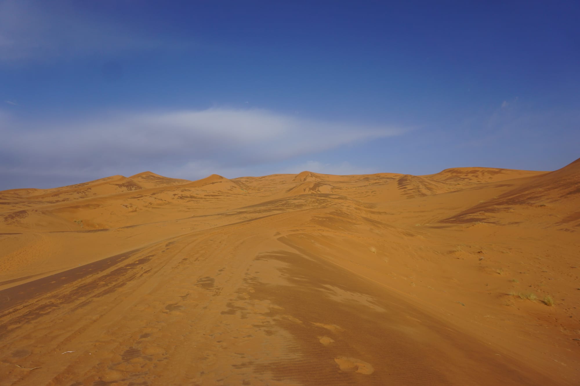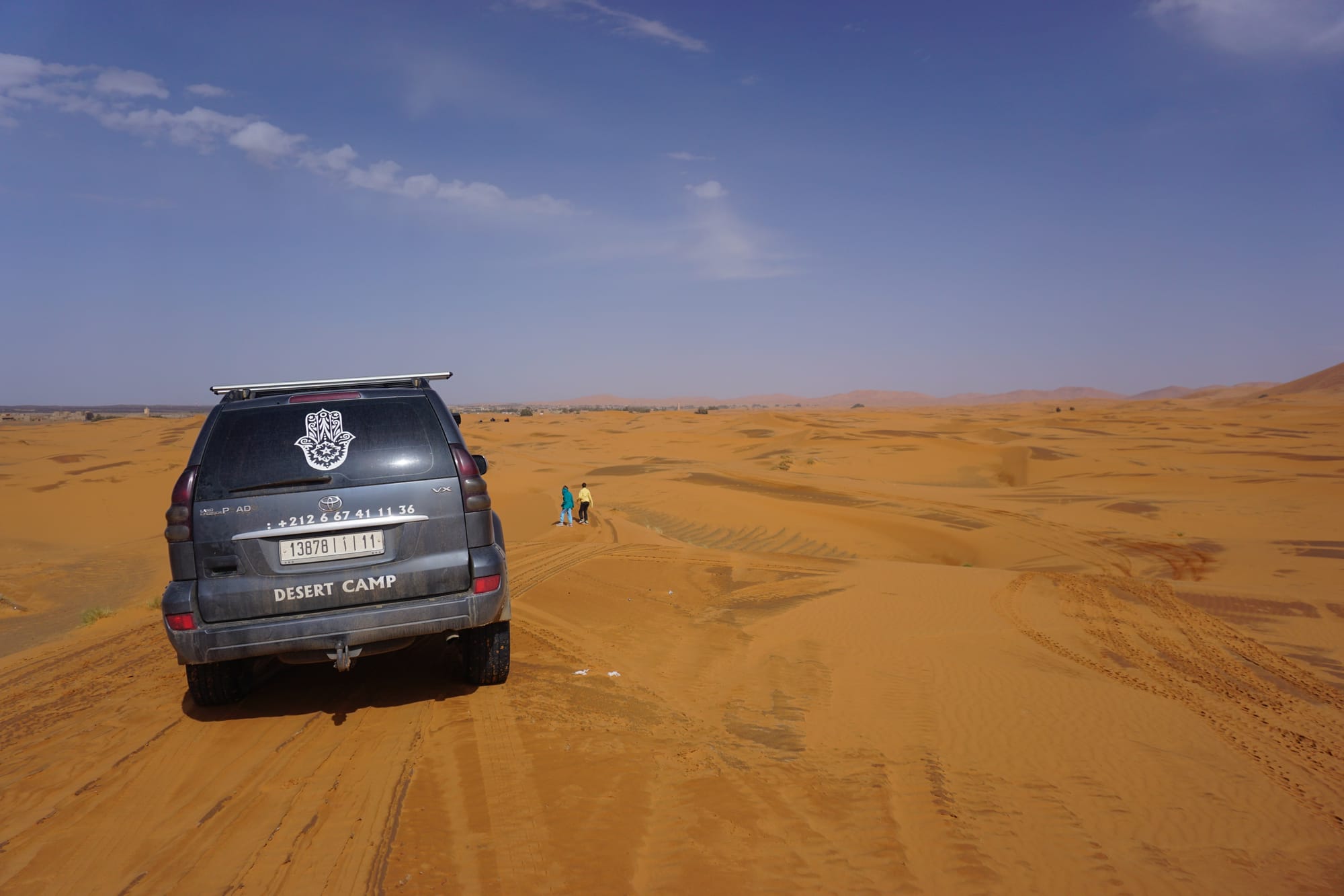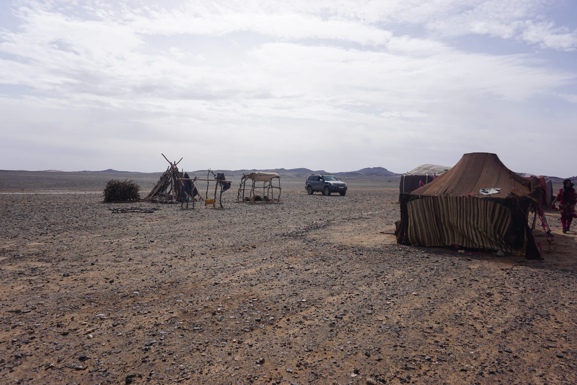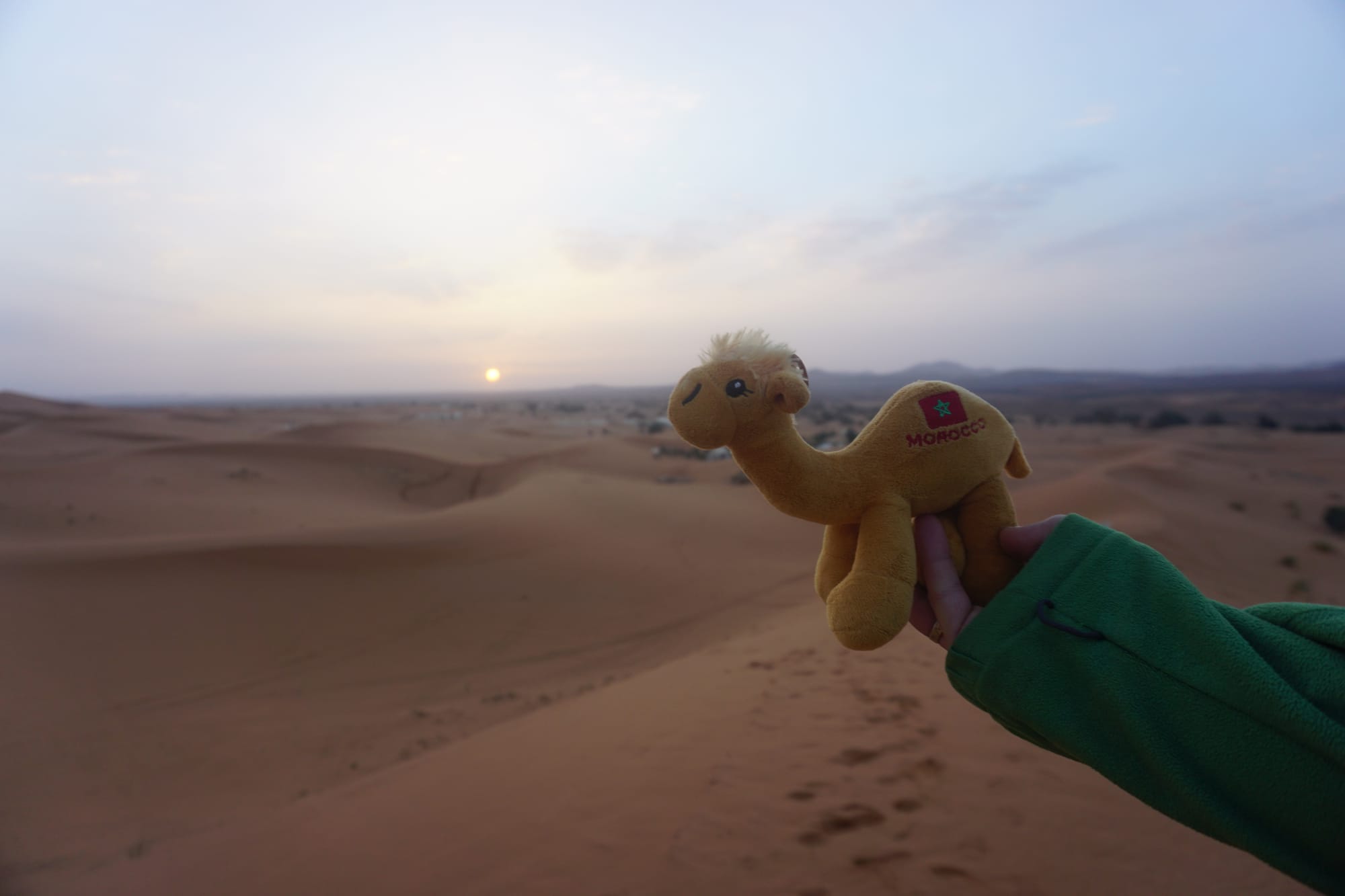 Po iššūkių pilnos kelionės nuo Essouiros iki Merzougos, pagaliau pasiekėme Saharos dykumą. Čia turėjome praleisti dvi naktis, tokioje palapinių stovykloje vidury dykumos, kur palapinės yra su patogiom lovom, dušu, tualetu ir maistu. Labai fainas konceptas, tik šaltoka buvo naktimis. Mus pasitiko Merzourga mieste ir džipu nuvežė apie 4km į dykumą. Ten pirmą vakarą įsikūrėme, pavakarieniavome ir susidėliojome rytojaus planą. Šią dieną dar lynojo, dykuma buvo šlapia ir apniukusi!