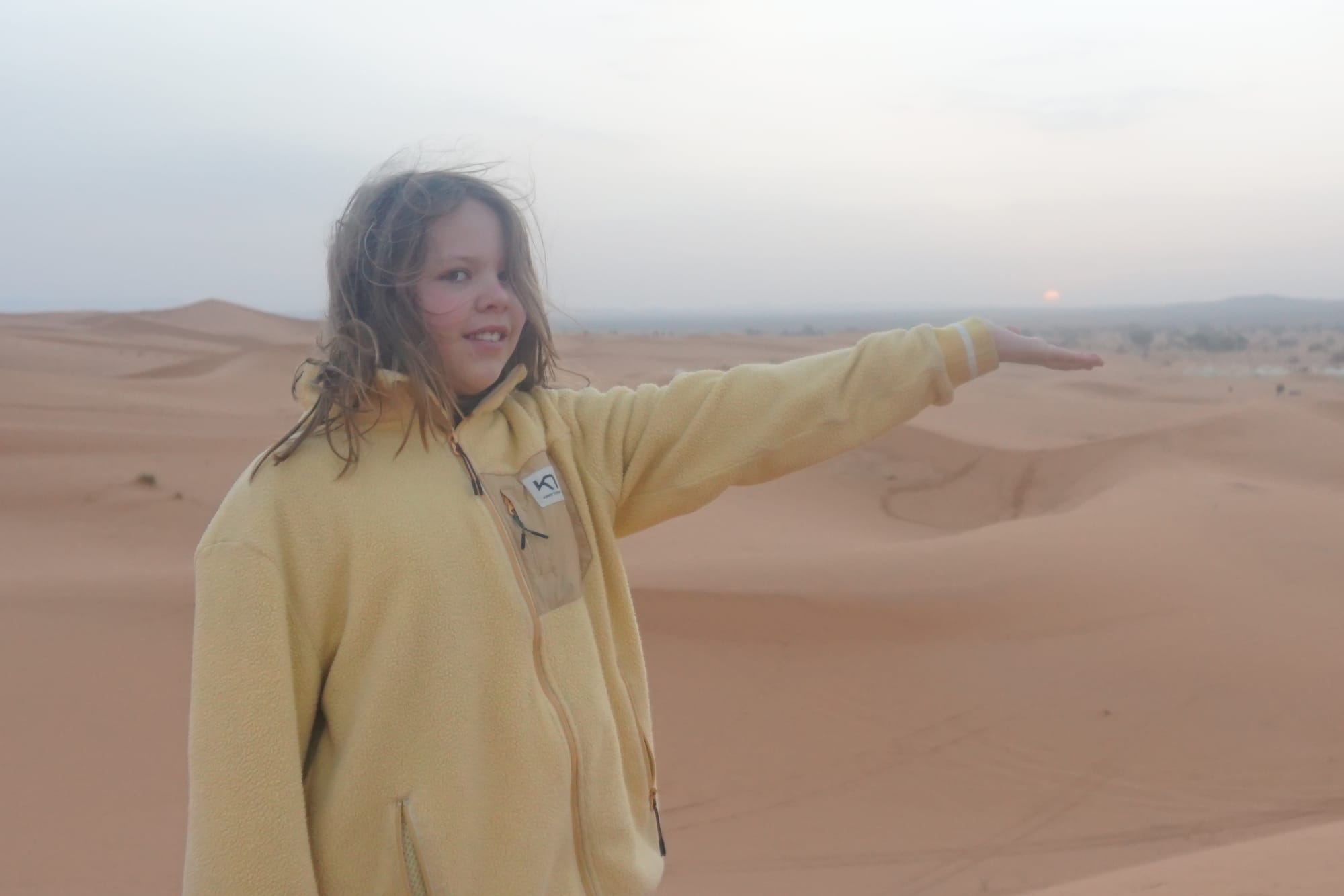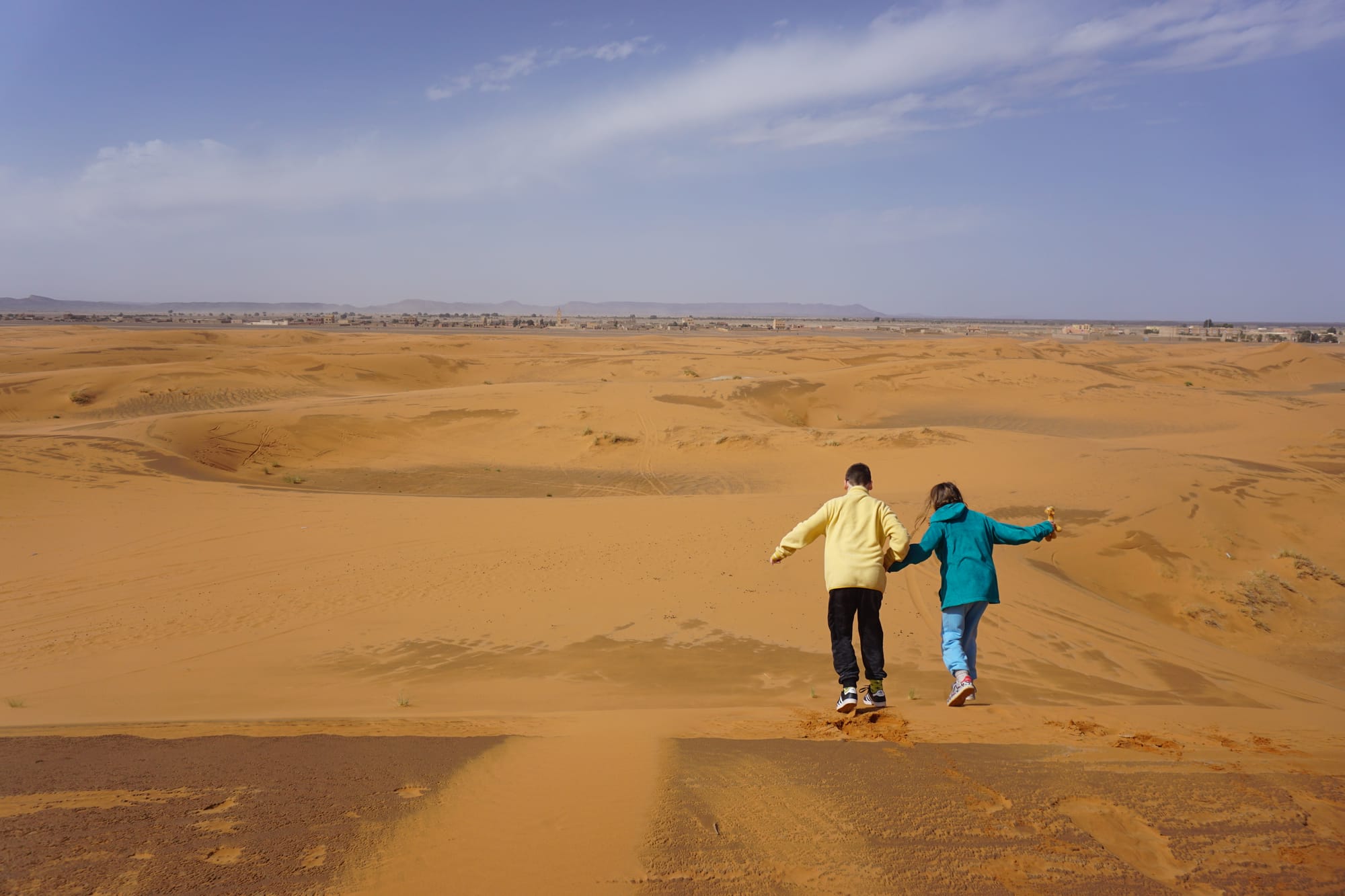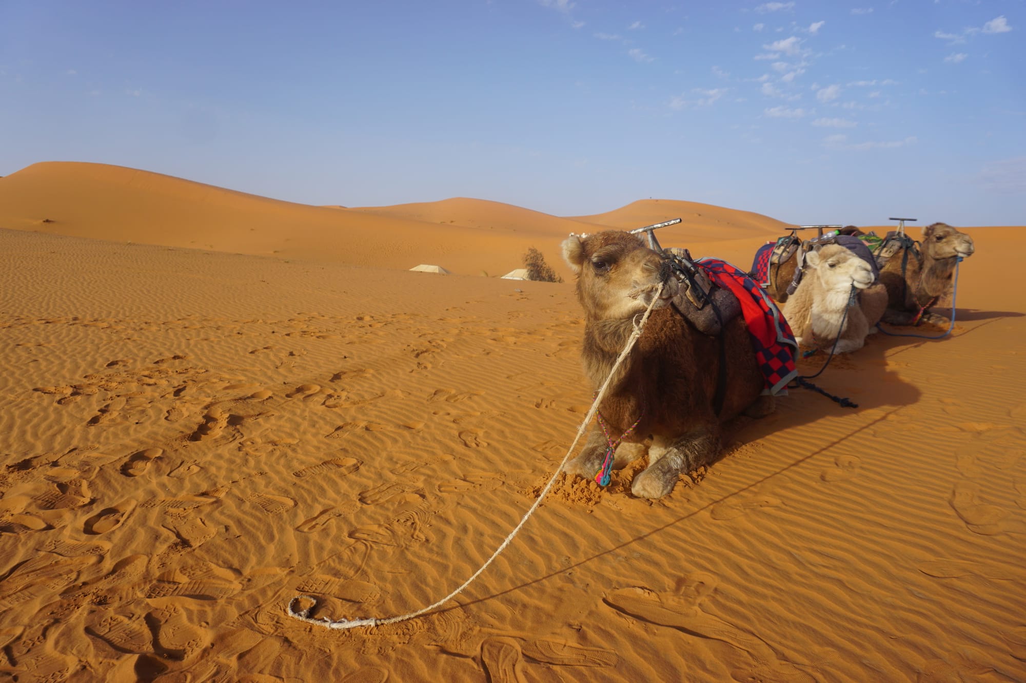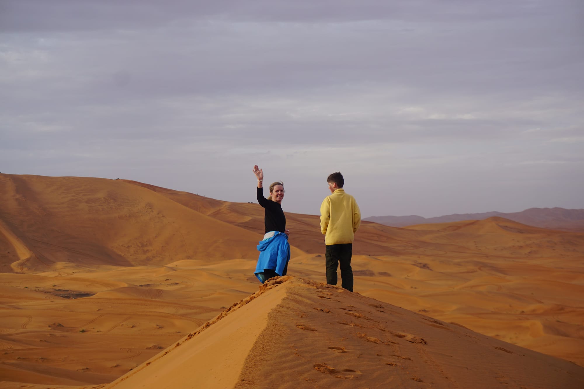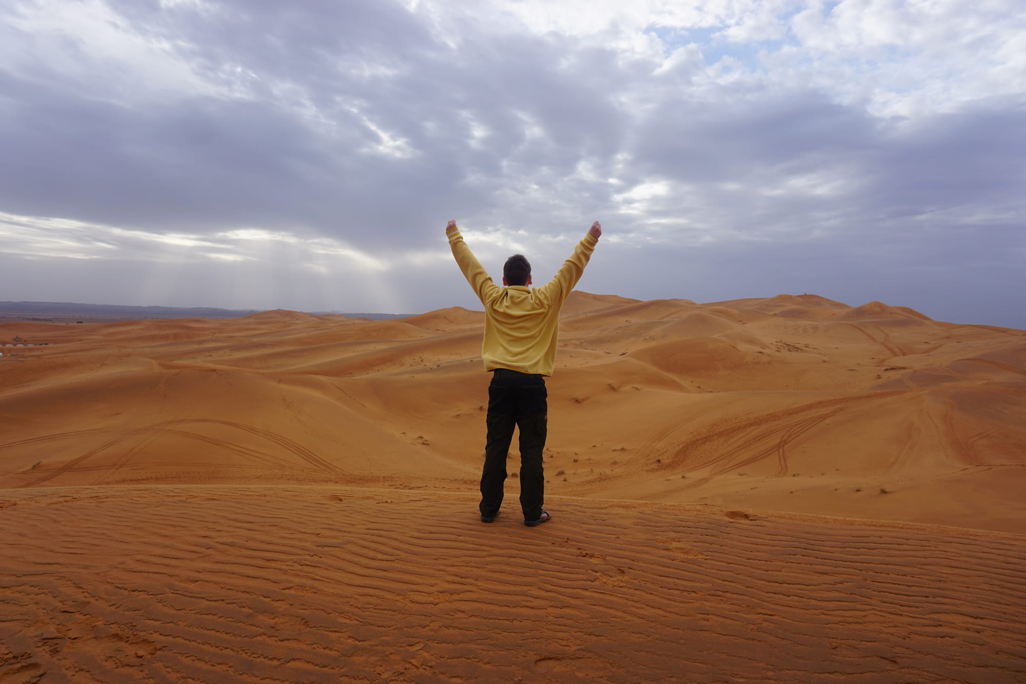 Po iššūkių pilnos kelionės nuo Essouiros iki Merzougos, pagaliau pasiekėme Saharos dykumą. Čia turėjome praleisti dvi naktis, tokioje palapinių stovykloje vidury dykumos, kur palapinės yra su patogiom lovom, dušu, tualetu ir maistu. Labai fainas konceptas, tik šaltoka buvo naktimis. Mus pasitiko Merzourga mieste ir džipu nuvežė apie 4km į dykumą. Ten pirmą vakarą įsikūrėme, pavakarieniavome ir susidėliojome rytojaus planą. Šią dieną dar lynojo, dykuma buvo šlapia ir apniukusi!