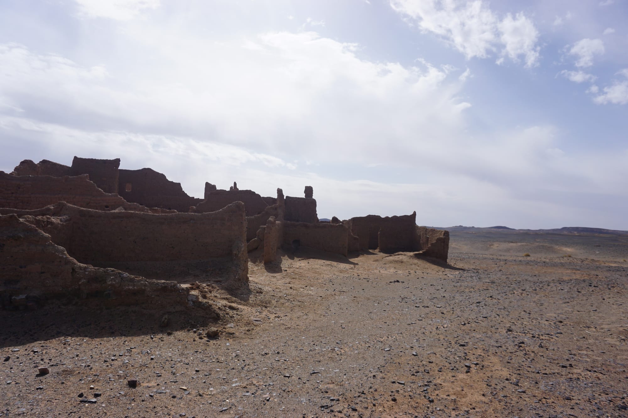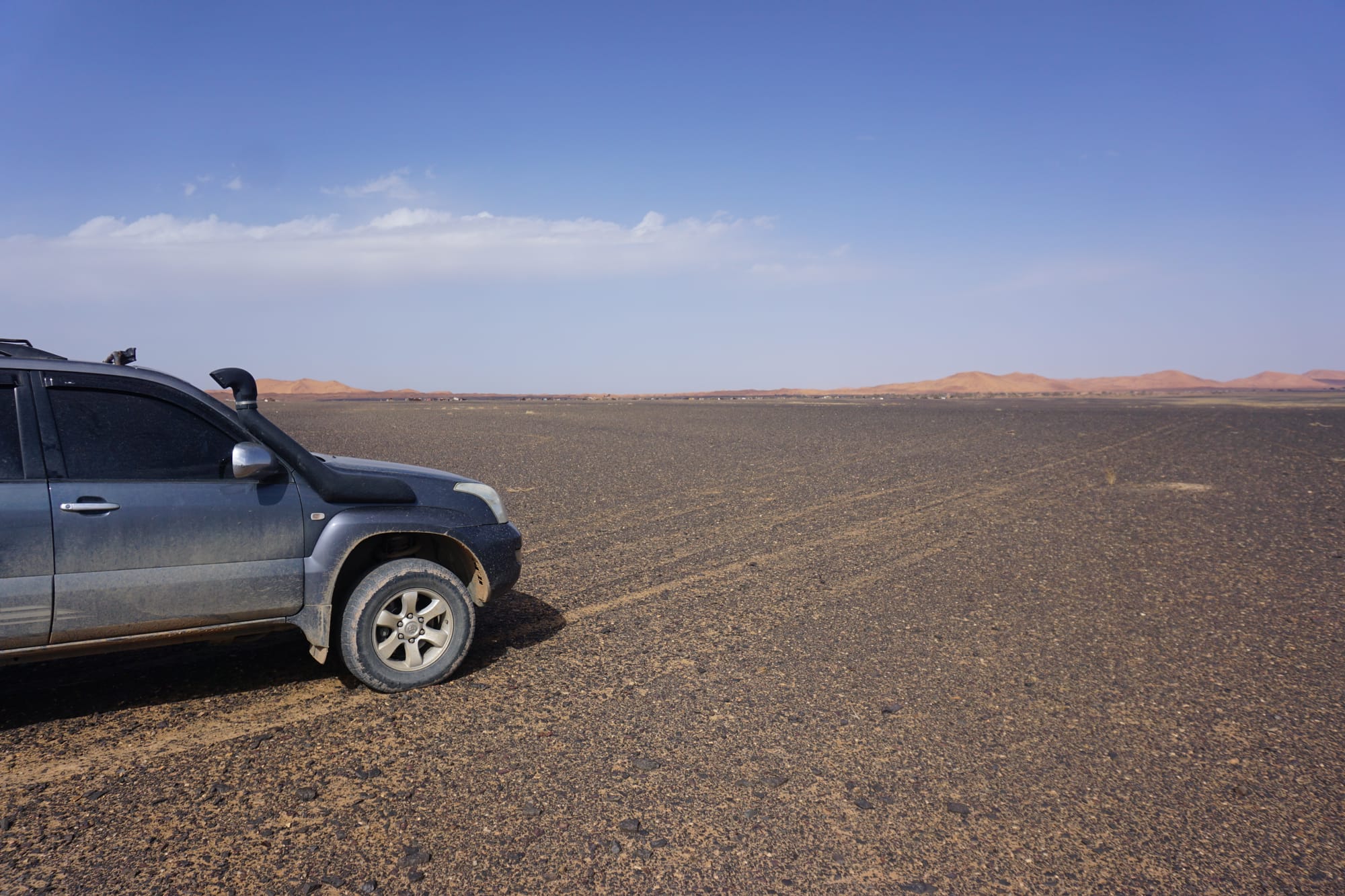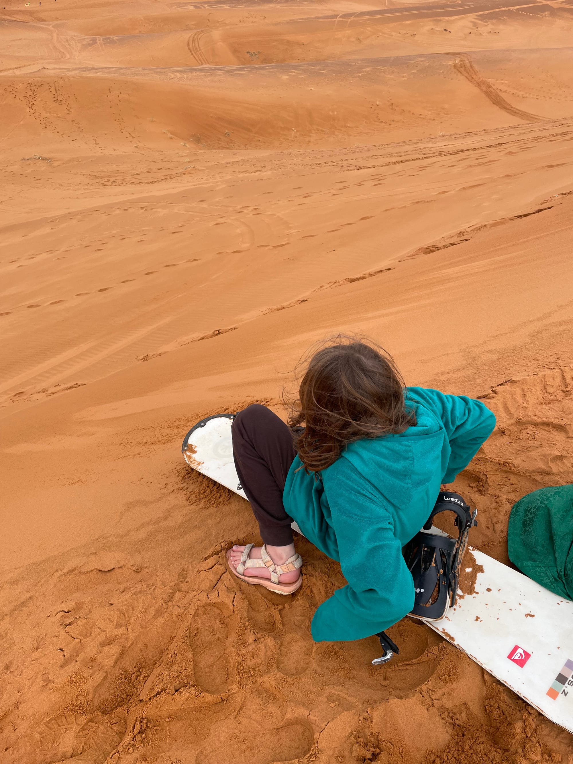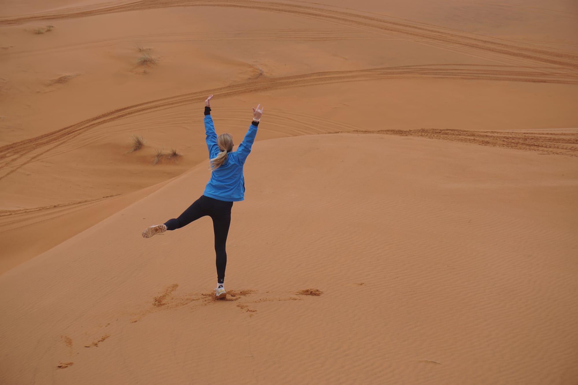 Po iššūkių pilnos kelionės nuo Essouiros iki Merzougos, pagaliau pasiekėme Saharos dykumą. Čia turėjome praleisti dvi naktis, tokioje palapinių stovykloje vidury dykumos, kur palapinės yra su patogiom lovom, dušu, tualetu ir maistu. Labai fainas konceptas, tik šaltoka buvo naktimis. Mus pasitiko Merzourga mieste ir džipu nuvežė apie 4km į dykumą. Ten pirmą vakarą įsikūrėme, pavakarieniavome ir susidėliojome rytojaus planą. Šią dieną dar lynojo, dykuma buvo šlapia ir apniukusi!