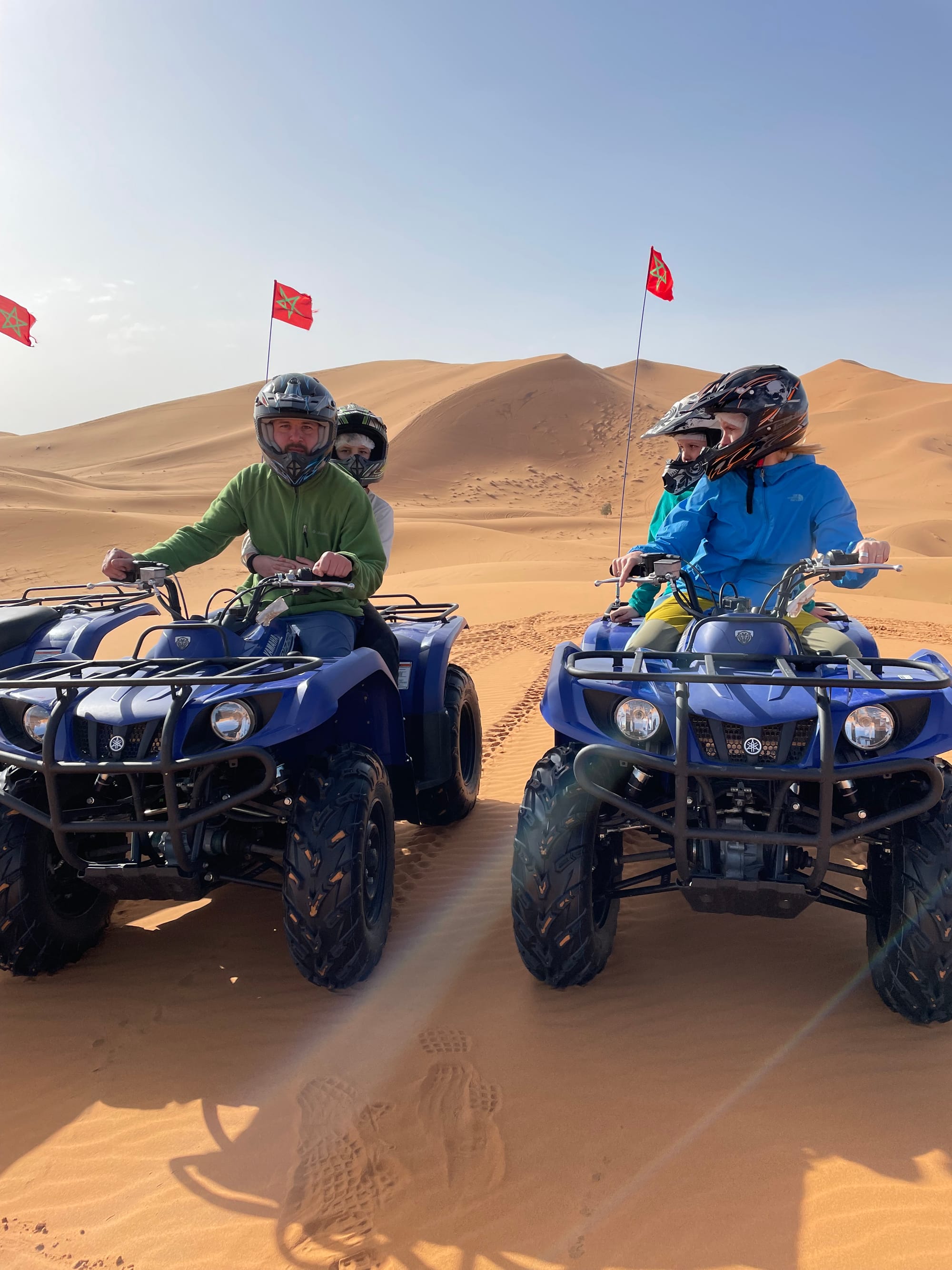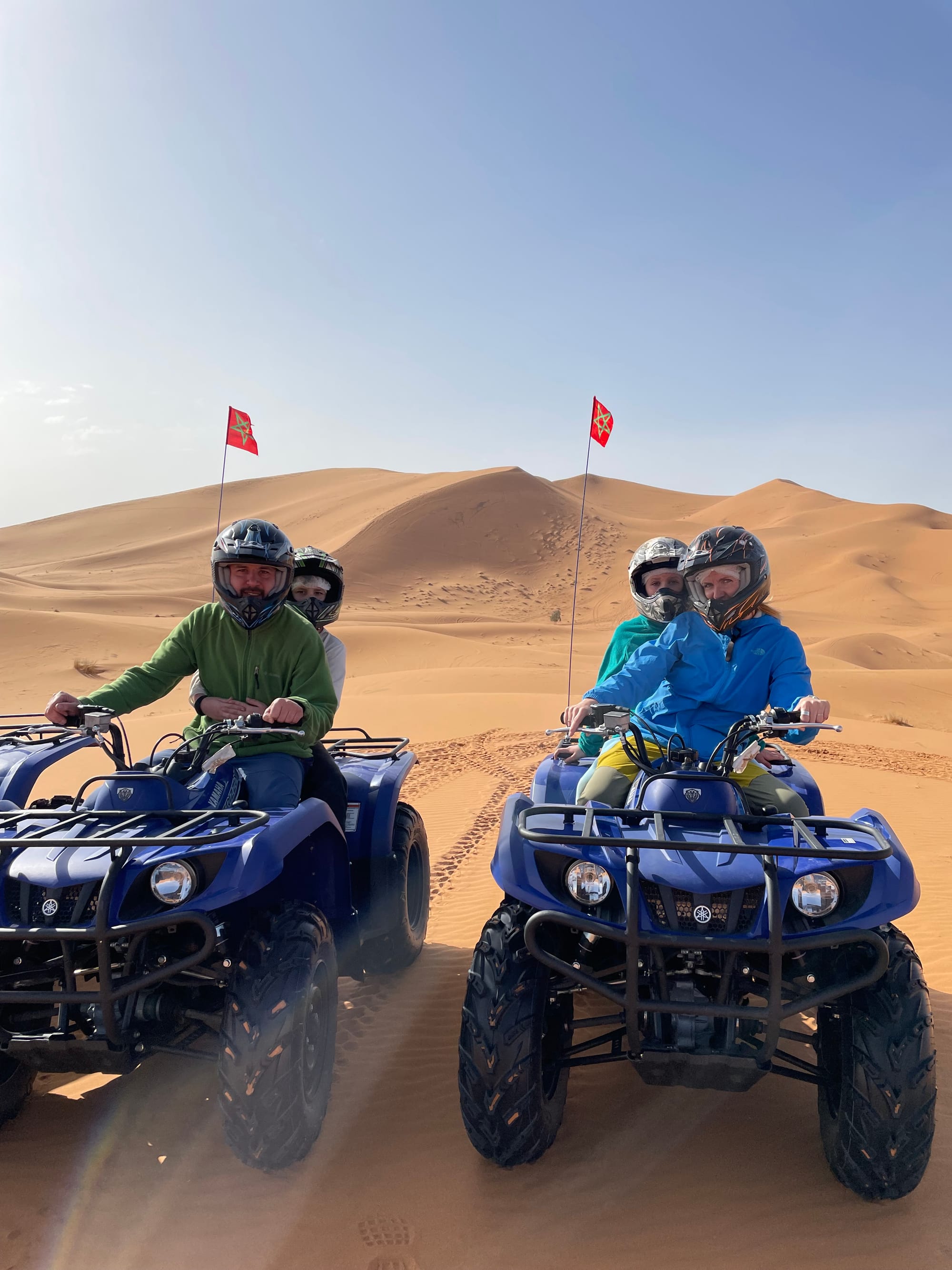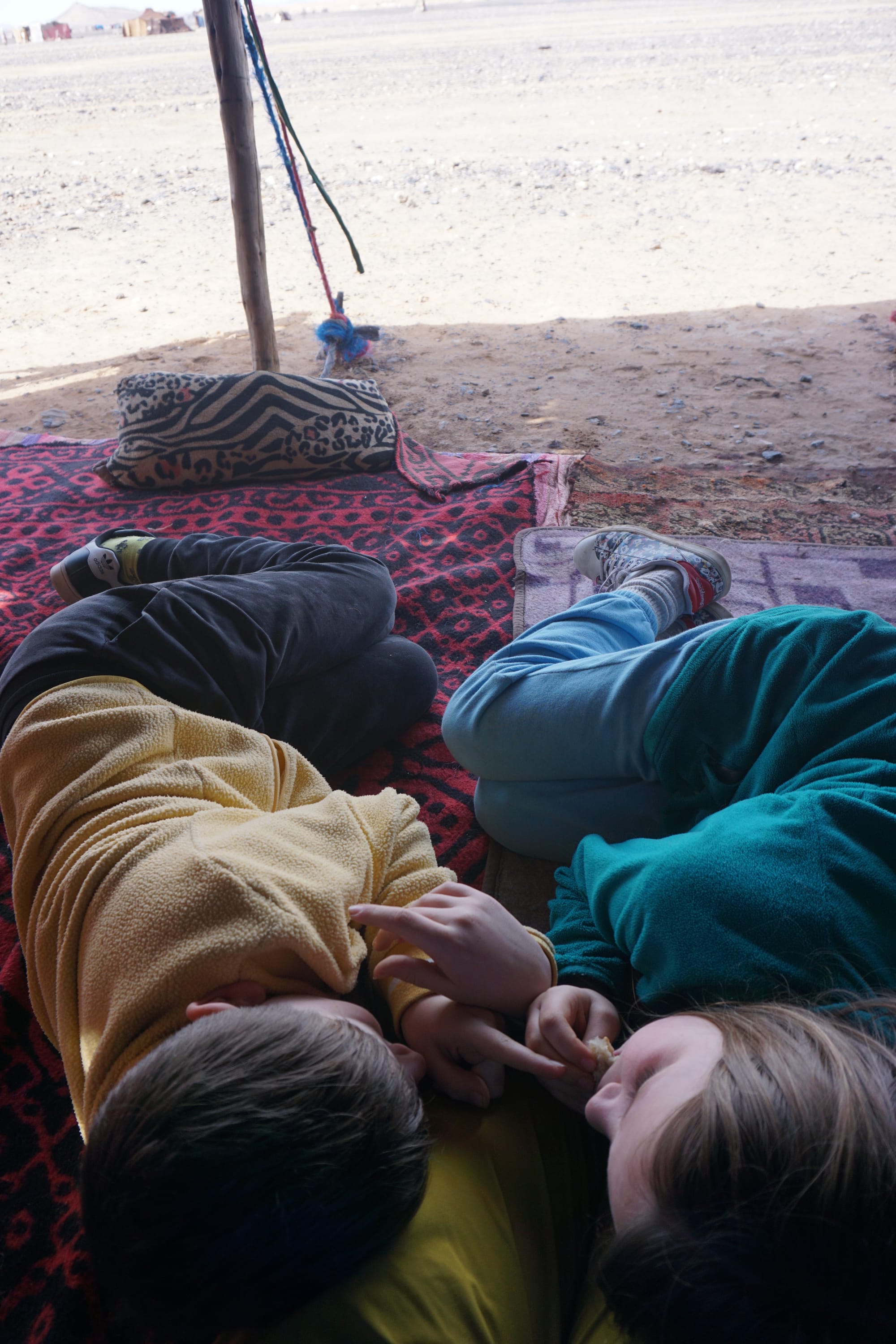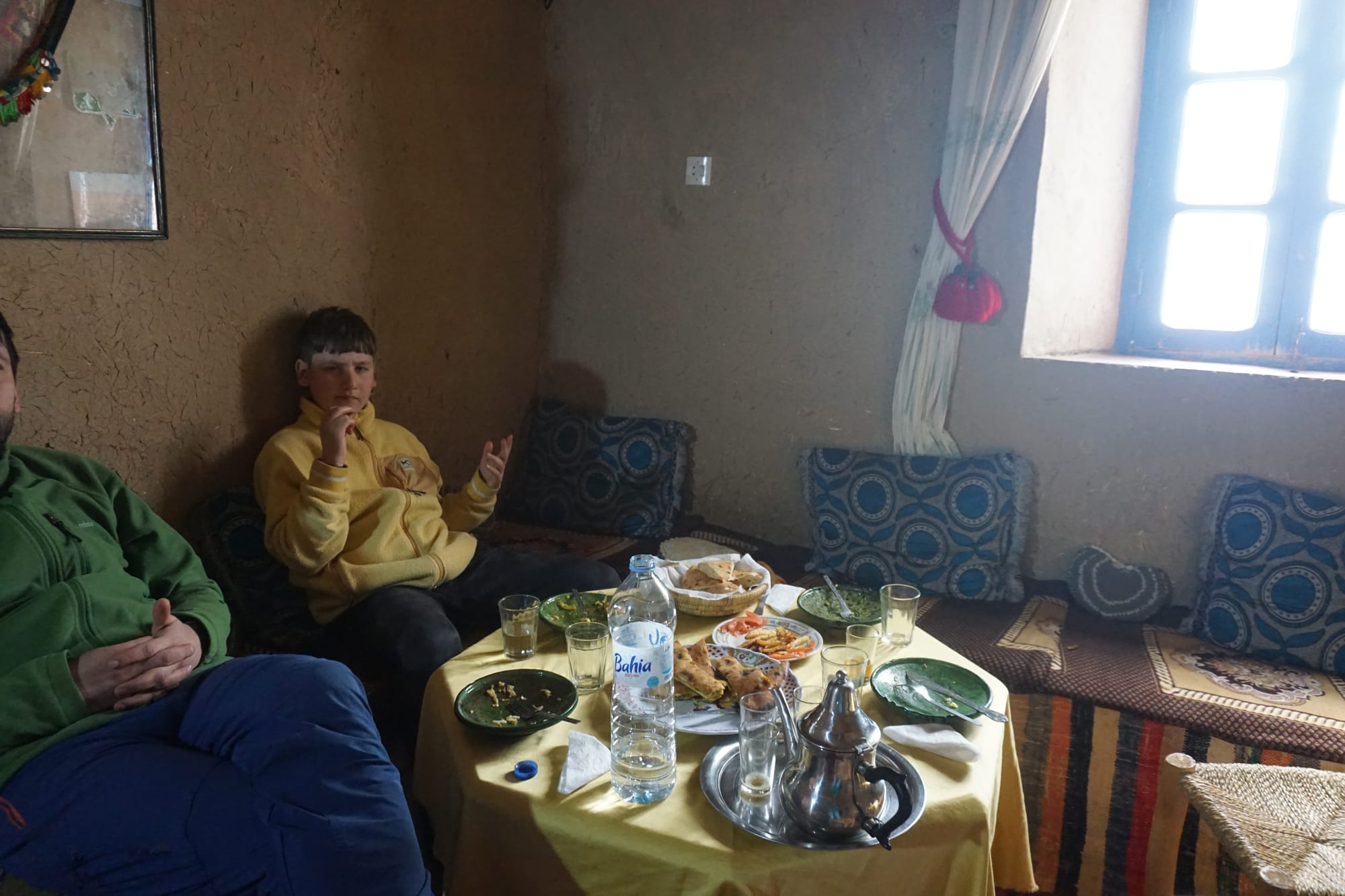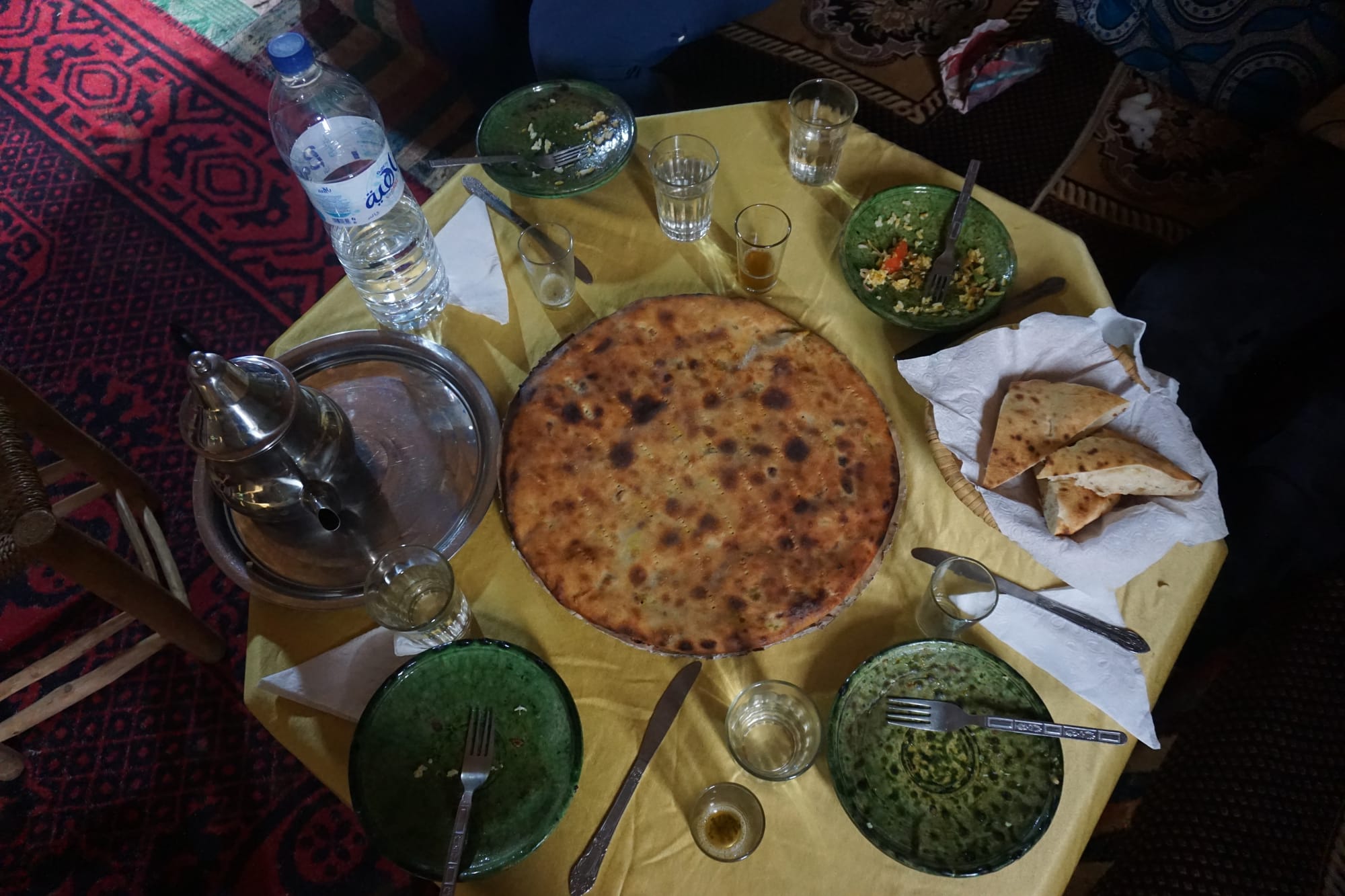 Po ekskursijos gidas mus nuvežė pas kažkokį savo draugą, kur mes pavalgėm labai skanios berberų picos, atsikvėpėm. O paskui valandą važinėjom po dykumą keturračiais ir galiausiai kupranugariais parėjom į savo stovyklą vakarieniauti ir miegoti.