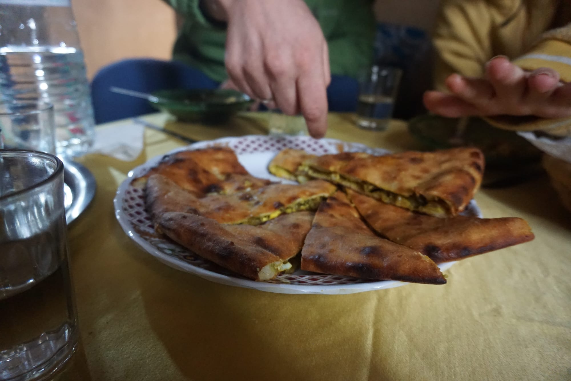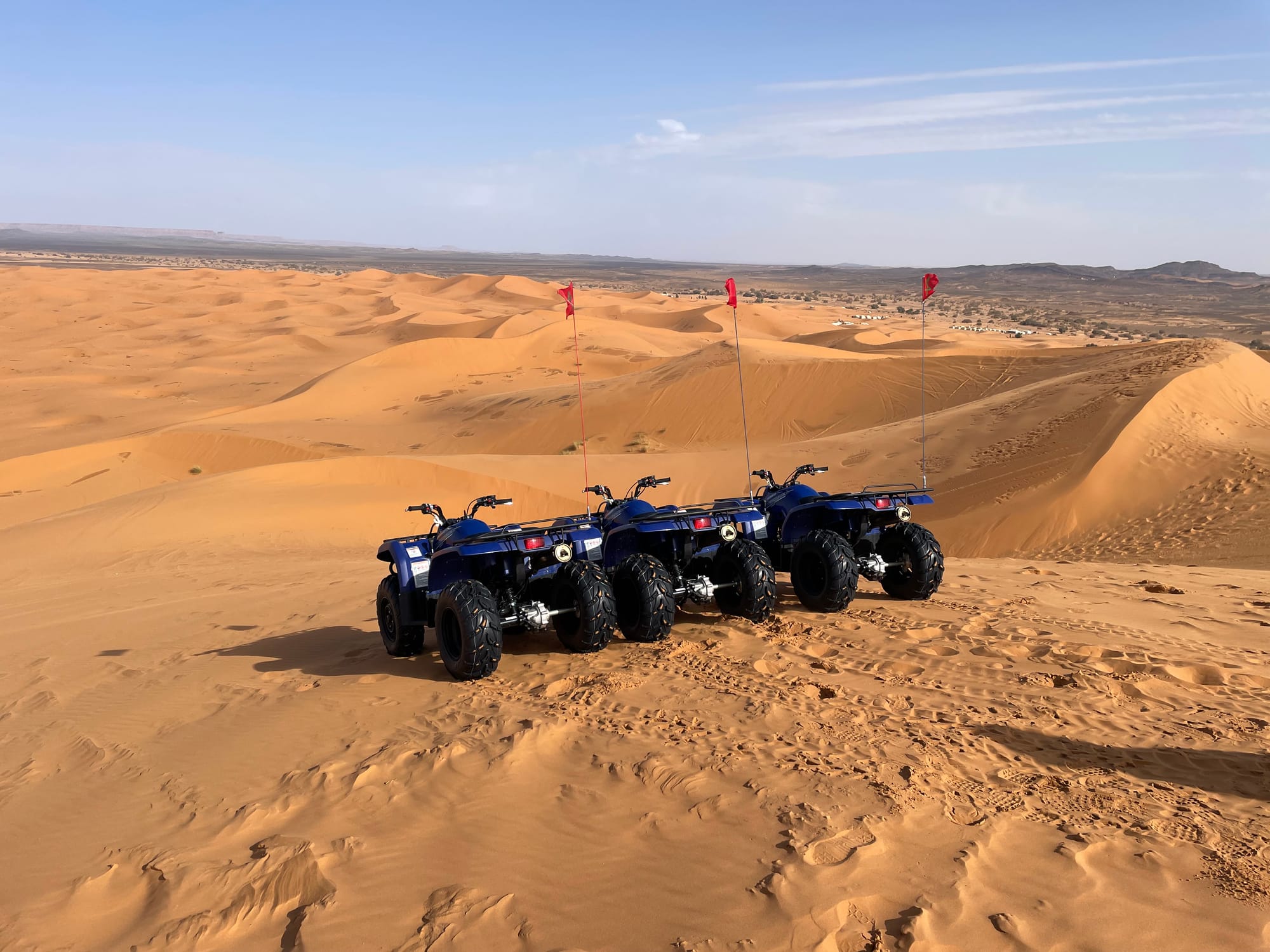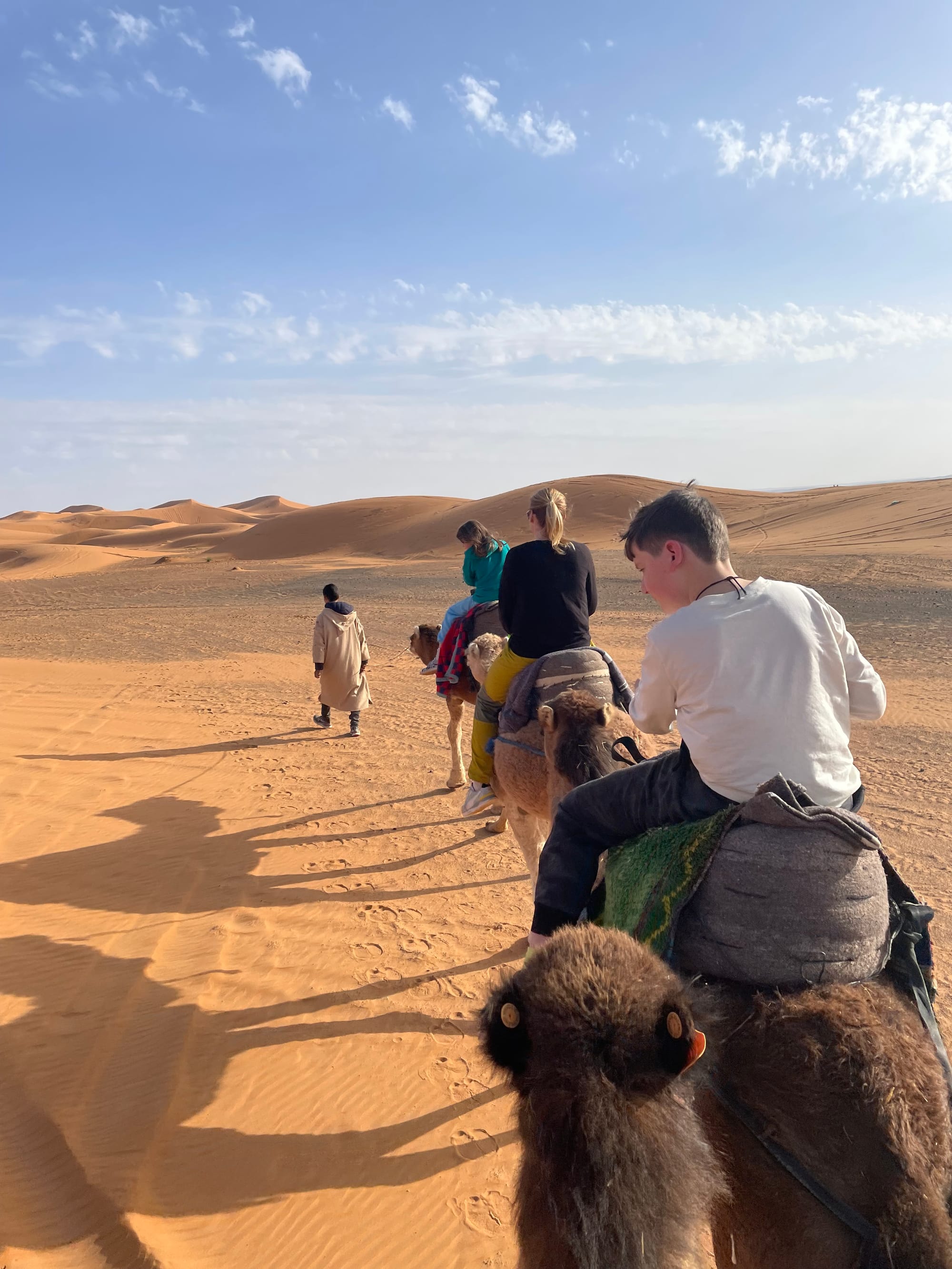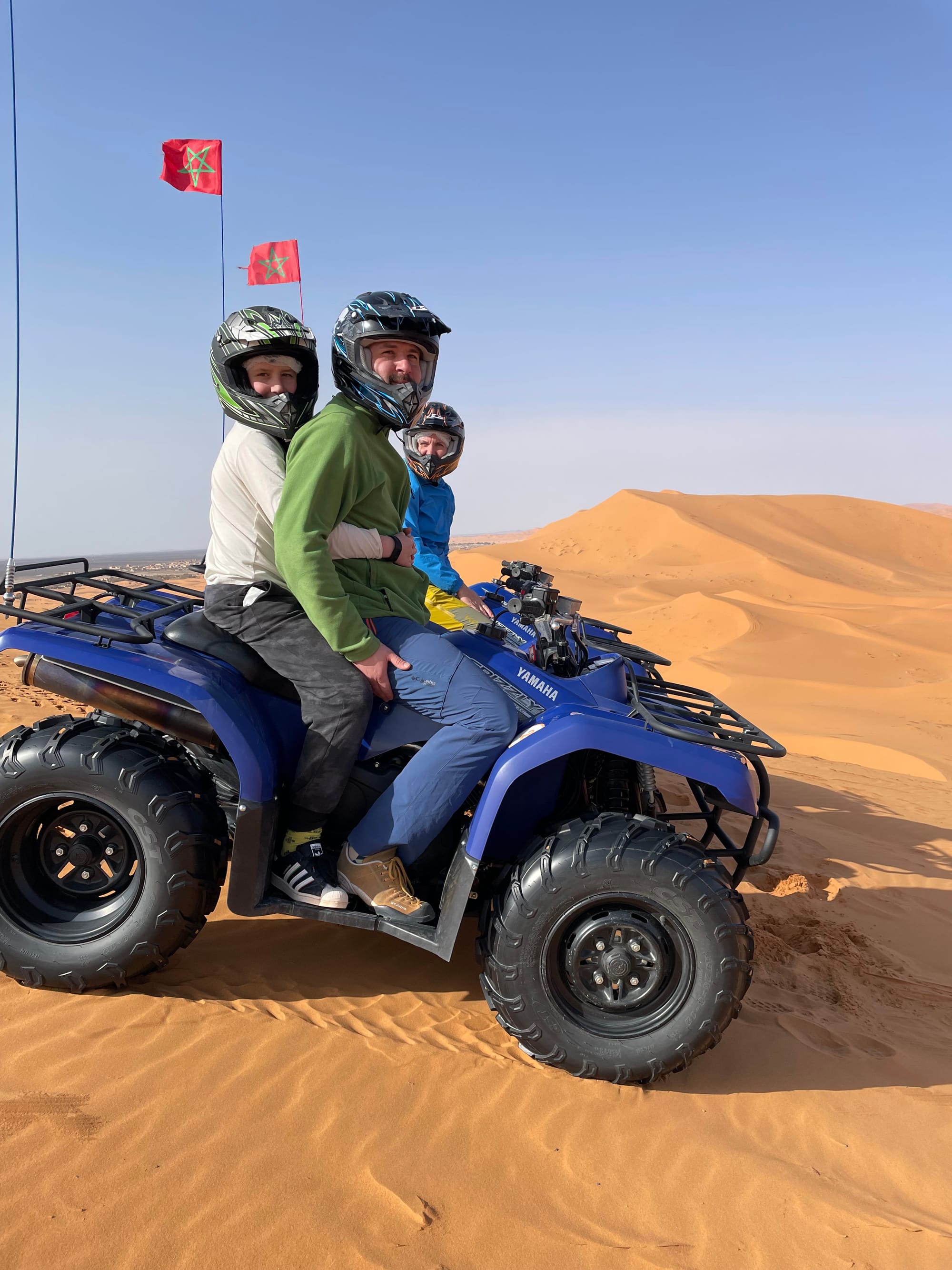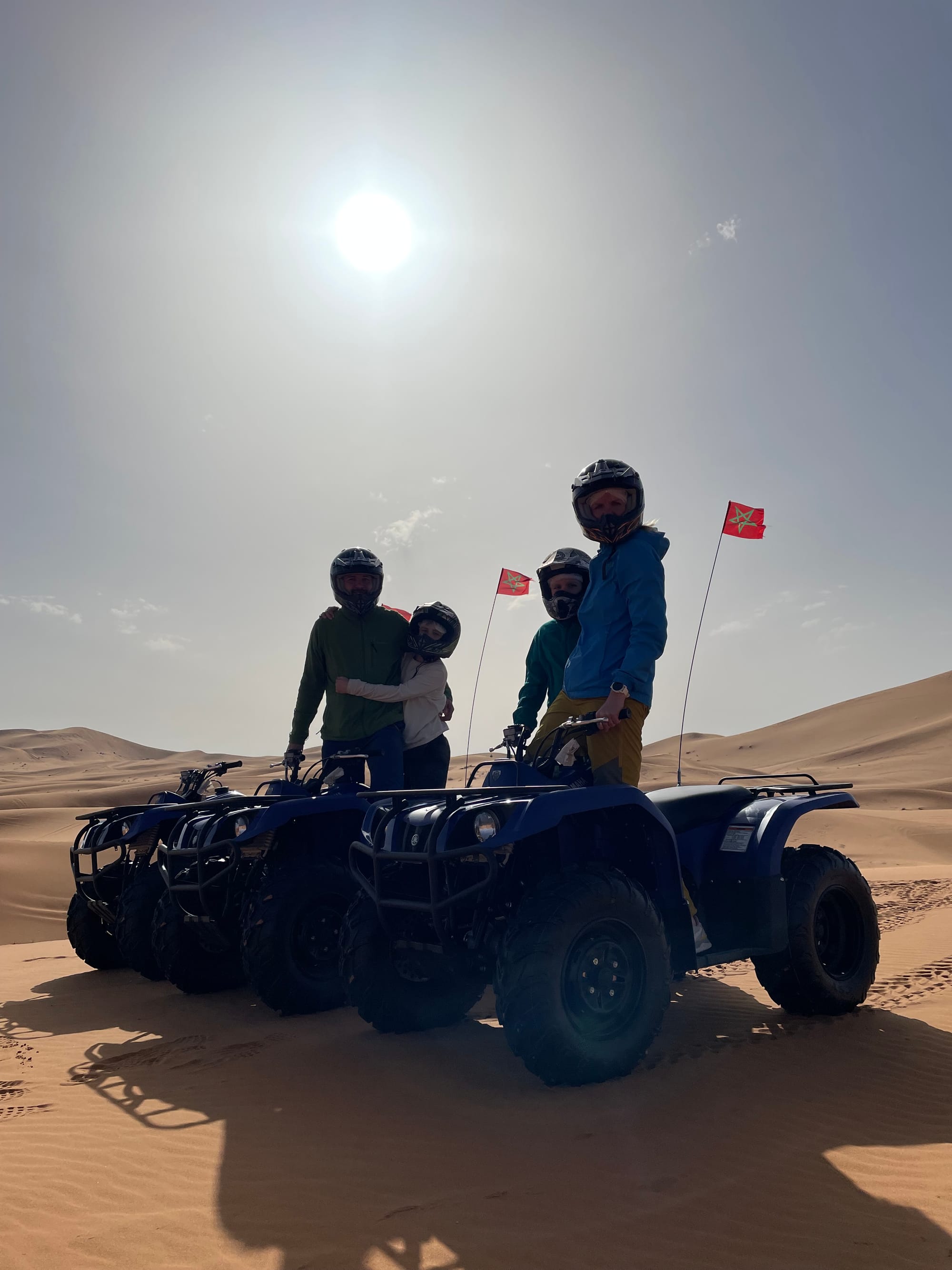 Po ekskursijos gidas mus nuvežė pas kažkokį savo draugą, kur mes pavalgėm labai skanios berberų picos, atsikvėpėm. O paskui valandą važinėjom po dykumą keturračiais ir galiausiai kupranugariais parėjom į savo stovyklą vakarieniauti ir miegoti.